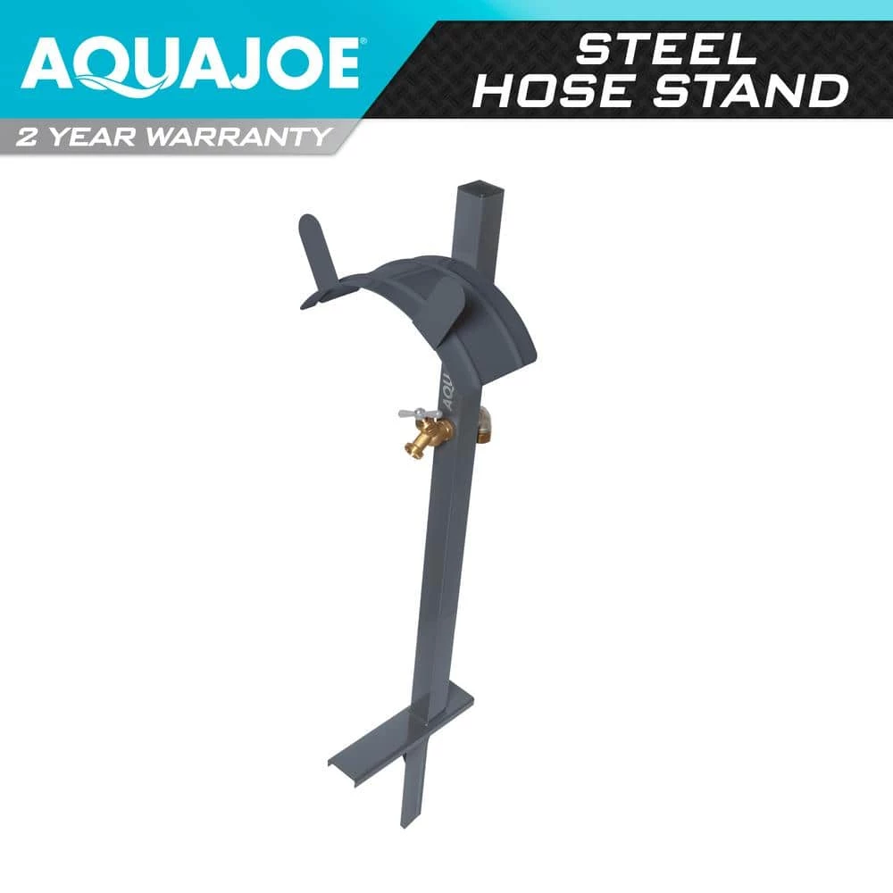 Say goodbye to tangled, heavy hoses and store your hose the neater way with the Steel Garden Hose Holder Faucet from AQUA JOE. The 42.5 in. H, powder coated pole and curved hanger are weather-resistant for a long-lasting luster and make an elegant addition to any garden landscape. Heavy-gauge steel construction and a secure 2-point soil anchor system allows you to store up to 125 ft. of your standard garden hose the stylish way, while giving you easy access to your faucet. Don’t stay trapped against your house simply connect your water source on 1 side, your hose on the other and relocate the stand to a more convenient location, away from shrubs, delicate plantings or cramped quarters. A solid brass spigot provides a secure, leak-proof connection for years of reliable performance in your yard and garden. So, stop straining simply put the water where you want it and Go With Joe for a neater, clutter-free hose storage solution.