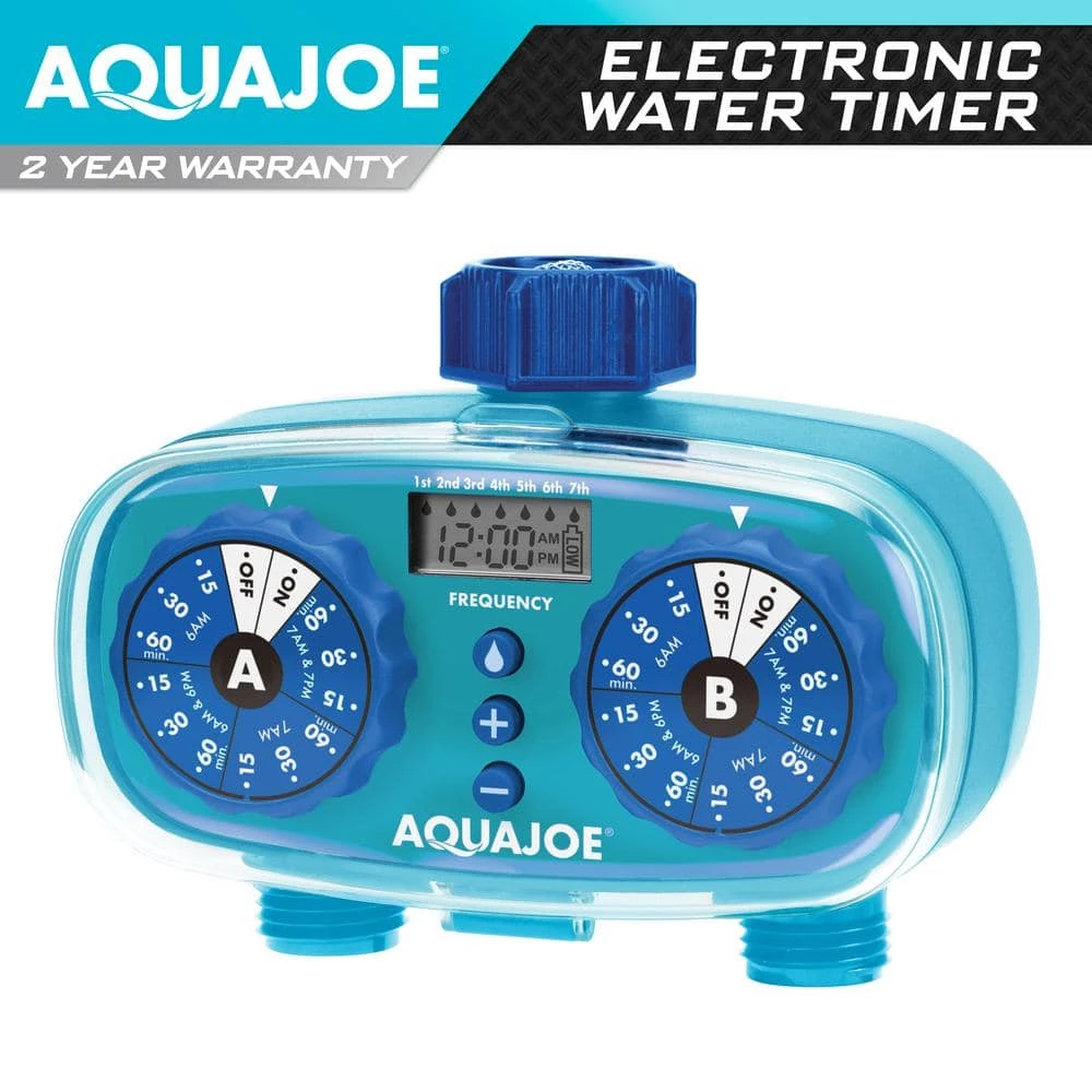 WATER ON TIME. Customize your irrigation system with the 2-Zone Electronic Water Timer from AQUA JOE, by SUN JOE. Reach your front lawn and back lawn, both sides of your house, and all areas of your garden with the 2 hose connections. The 13 preset programs offer a variety of options, or you can set your own watering duration and frequency. The onboard control panel allows you to customize each zone with a separate watering schedule, for the perfectly watered yard plus garden every time. Water for up to 60-minutes a cycle, for multiple hours of the day. Just connect the hose and accessories, and water away. So, give your lawn a cool drink of water on your schedule with the 2-Zone Electronic Water Time from AQUA JOE, by SUN JOE. GET EQUIPPED.