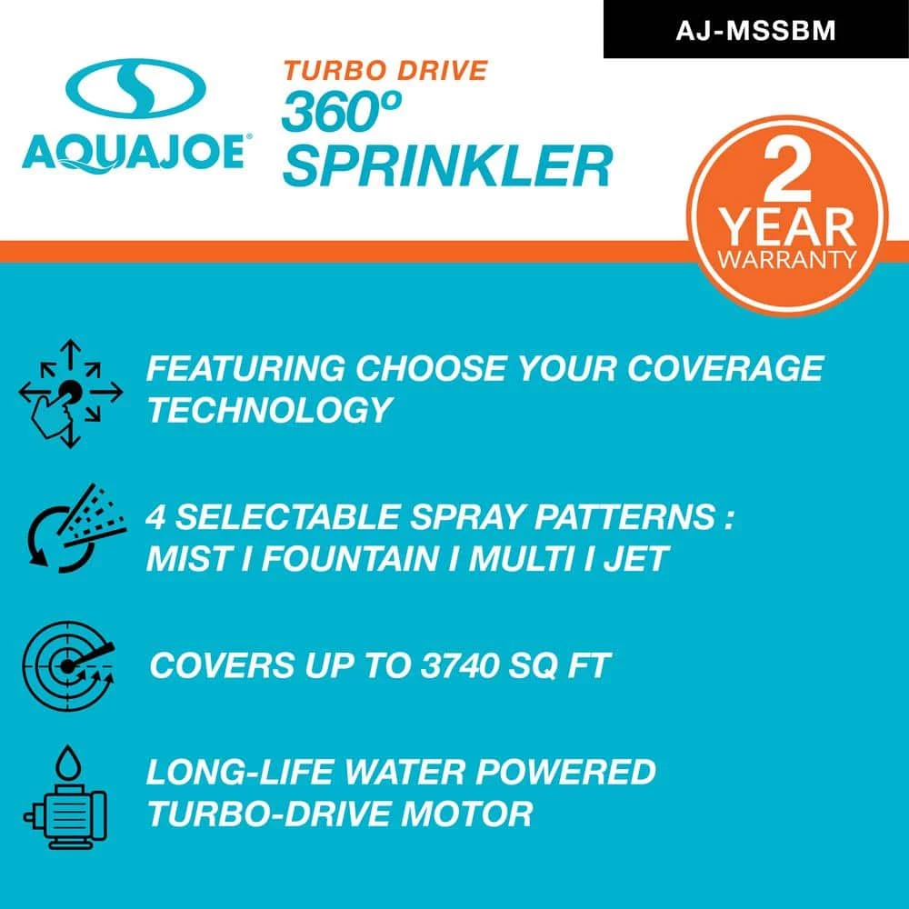 PUT THE WATER PRECISELY WHERE YOU WANT IT. No more wasted water or overspray – keep your grass green and lawn lush with the AJ-MSSBM 4-Pattern Turbo Drive 360° Sprinkler from AQUA JOE. With AQUA JOE’s completely customizable coverage`, you’ll have the control you need to make your yard the envy of the entire neighborhood. Water your way with just a twist of the 4 selectable spray patterns: mist, fountain, multi or jet, powered by AQUA JOE’s turbo drive motor for quiet, dependable operation, season after season. Then, slide the tabs to set your range, adjust the desired distance, coverage and rotation – up to 3740 sq. ft., ideal for most lots, lawns and gardens. A sturdy weatherproof base provides enhanced stability and durability for outdoor use, plus AQUA JOE’s durable, zinc fittings provide a secure, leak-proof connection to a standard garden hose. When it comes to watering with customizable control, go with the flow – and Go With Joe.