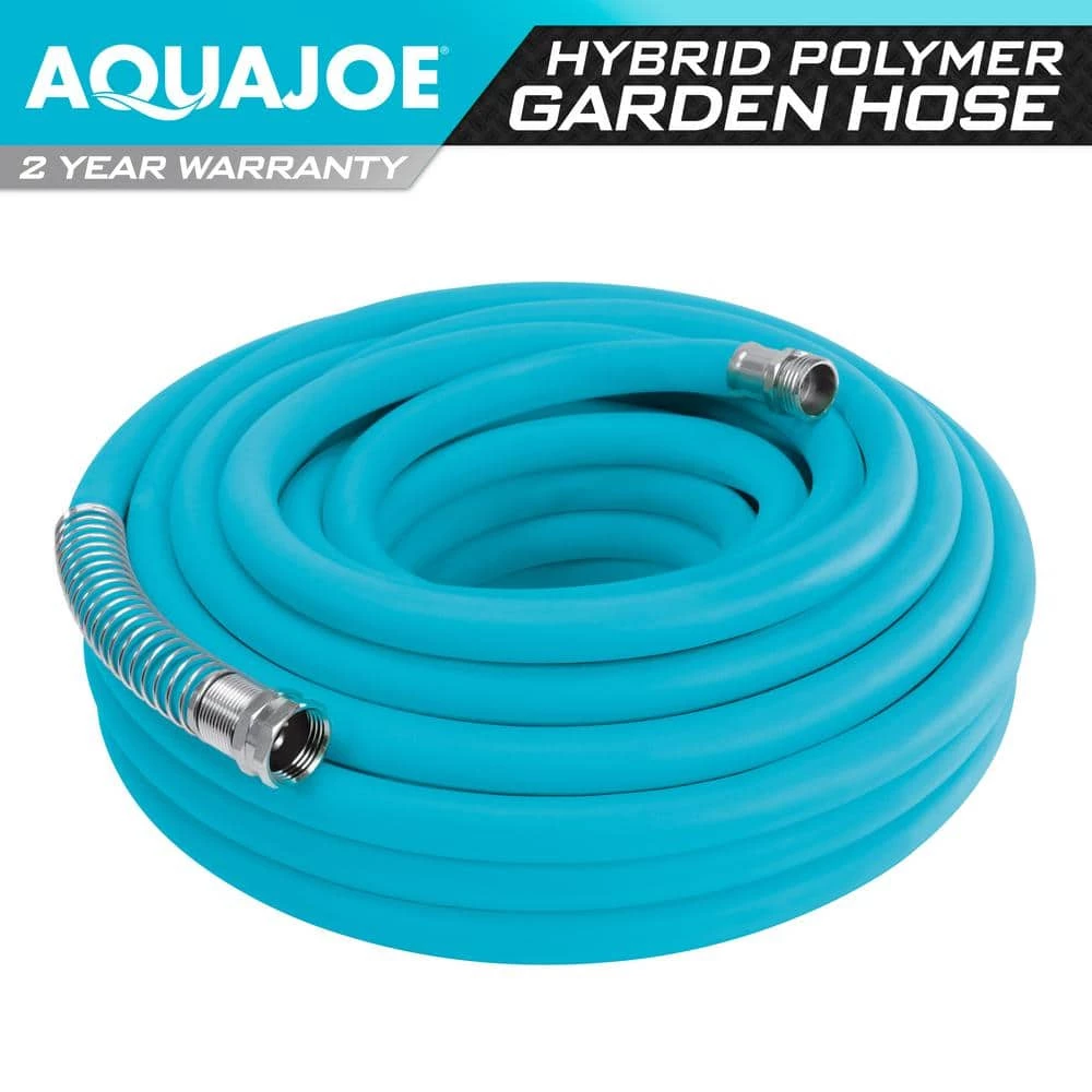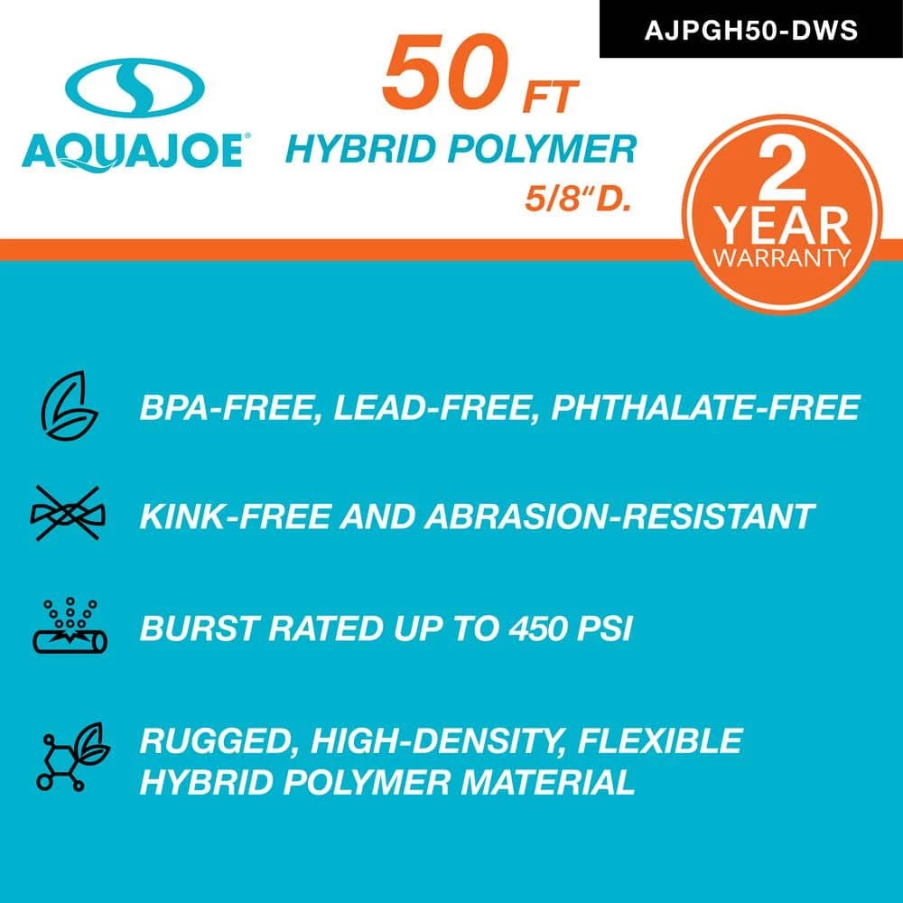 DRINKING WATER SAFE. Water your lawn with uninterrupted flow with the AJPGH50-DWS Hybrid Polymer Garden Hose from Aqua Joe. Constructed from a rugged, high-density, flexible hybrid-polymer material for maximum durability performance, Aqua Joe wont twist, kink or tangle. Lightweight and easy to maneuver around trees, corners, plants, and other obstacles, you can water your yard garden without having to stop and straighten the hose. Equipped with solid, male female aluminum connectors, Aqua Joe provides a secure, leak-proof connection. The coiled spring bend restrictor provides unrestricted flow without the worry of twisting at the spigot. And the sturdy hybrid-polymer material is crush-proof, abrasion-resistant, and drinking water safe. So, give your lawn a cool drink of water and take a sip for yourself with the AJPGH50-DWS 50 ft. Hybrid Polymer Garden Hose from Aqua Joe.