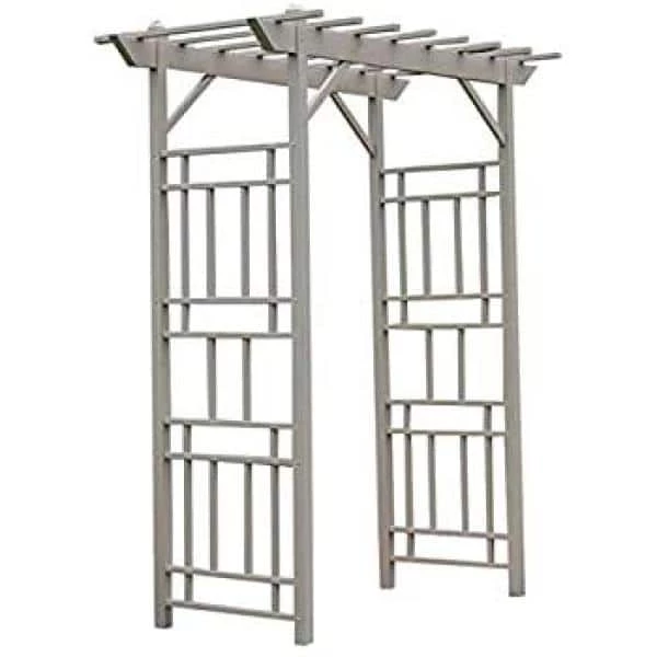 Infuse your garden with contemporary design by adding the DuraTrel Wellington 72 in. x 85 in. White Vinyl Arbor to your yard. This unique arbor has a pergola-style flat top supported by side panels with crisp, intricate geometric designs. The straight lines will contrast beautifully with the flowing forms of nature for an eye-catching effect. Train wisteria, ivy, or even grapes to weave in and out of the grid to create personalized modern art in your yard. Your arbor will look like it has always been there due to the subtle brown color, which resembles natural aged wood. However, the arbor is made of durable vinyl with titanium oxide that protects the material from damaging UV rays. Your arbor will never fade, crack, peel, or need to be painted. Arbor pieces arrive pre-fabricated for quick and easy assembly. The ground anchors and all necessary hardware are included. All DuraTrel products come with a 20-year limited manufacturer warranty.