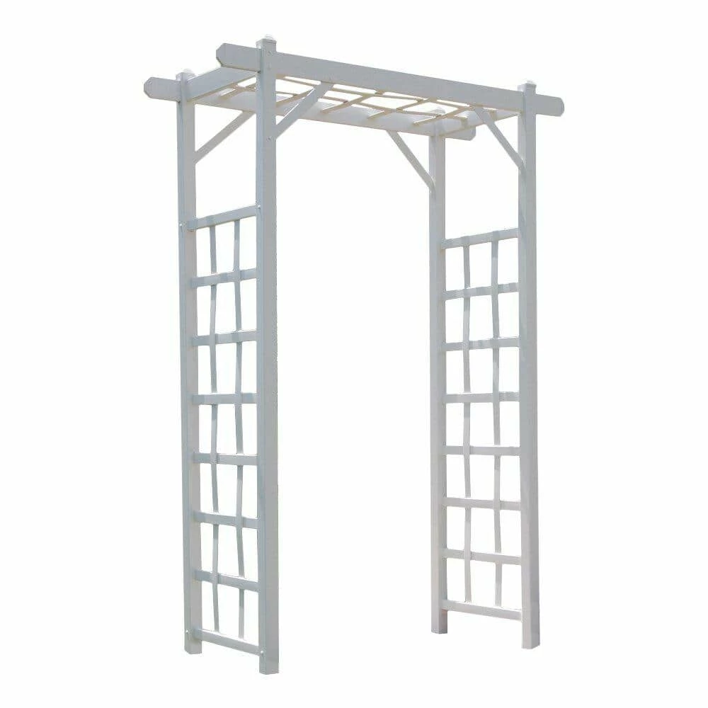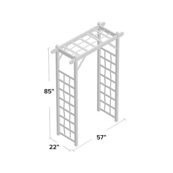 The DuraTrel Elmwood 57 in. x 85 in. White Vinyl Arbor uses slim construction to serve as a skeleton for draping clematis or wisteria. The twisting vines will eventually overtake the framework to welcome guests into your garden via a doorway of greenery and fragrant blossoms. Only a glimpse of the crisp, straight lines will peek out, but the arbor itself will serve as a beautiful hardscape element all on its own until the plants take over. Made from PVC with a UV stabilizer so it won’t rot, crack, or fade even after years of exposure to the elements. It arrives ready to assemble, and includes all hardware and ground anchors. All Duratrel products come with a 20-year limited manufacturer warranty.
