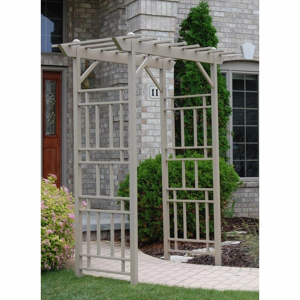 Infuse your garden with contemporary design by adding the DuraTrel Wellington 72 in. x 85 in. Mocha Vinyl Arbor to your yard. This unique arbor has a pergola-style flat top supported by side panels with crisp, intricate geometric designs. The straight lines will contrast beautifully with the flowing forms of nature for an eye-catching effect. Train wisteria, ivy, or even grapes to weave in and out of the grid to create personalized modern art in your yard. Your arbor will look like it has always been there due to the subtle brown color, which resembles natural aged wood. However, the arbor is made of durable vinyl with titanium oxide that protects the material from damaging UV rays. Your arbor will never fade, crack, peel, or need to be painted. Arbor pieces arrive pre-fabricated for quick and easy assembly. The ground anchors and all necessary hardware are included. All DuraTrel products come with a 20-year limited manufacturer warranty.