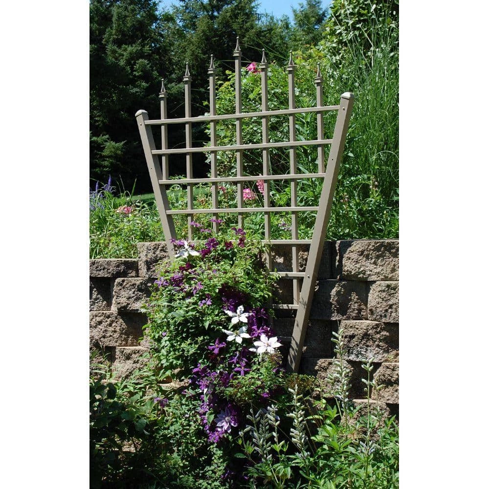 The finials on the DuraTrel Estate 58 in. x 94 in. Mocha Vinyl Fan Trellis add a majestic touch to your landscape while being sturdy enough to support your climbing flowers and vines. Constructed of highly durable PVC vinyl, the trellis is weather-resistant and maintenance-free. The 20-year limited manufacturer warranty guarantees your trellis will not fade, crack or peel ensuring years of beauty without the hassle of sanding, painting or staining. Wall mount anchors included.