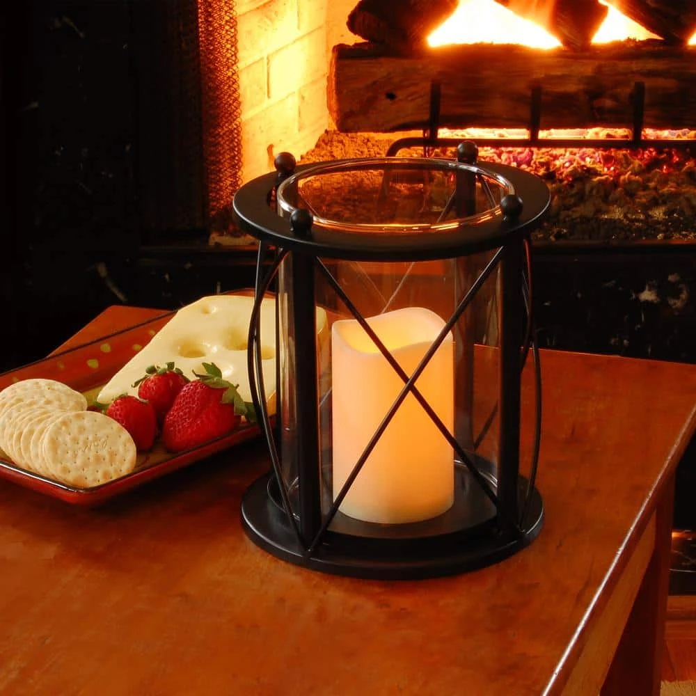 This beautifully crafted black metal hurricane with a crisscross design and crystal clear glass includes a glowing flameless pillar candle with a timer. The four metal main posts capped with a ball shape finial connected with a crisscross wire pattern to complete this unique design. The chic style makes it ideal for any occasion and everyday home decor. The amber pillar LED candle features a 5 hour on/19 hours off timer. Requires 3 AAA batteries, not included. The glass cylinder can be removed to clean.