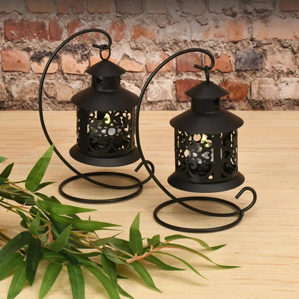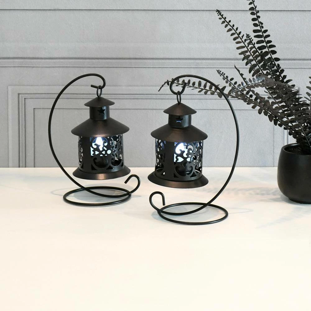 - Included: 2 Tabletop Metal Lanterns with Hanging Hooks