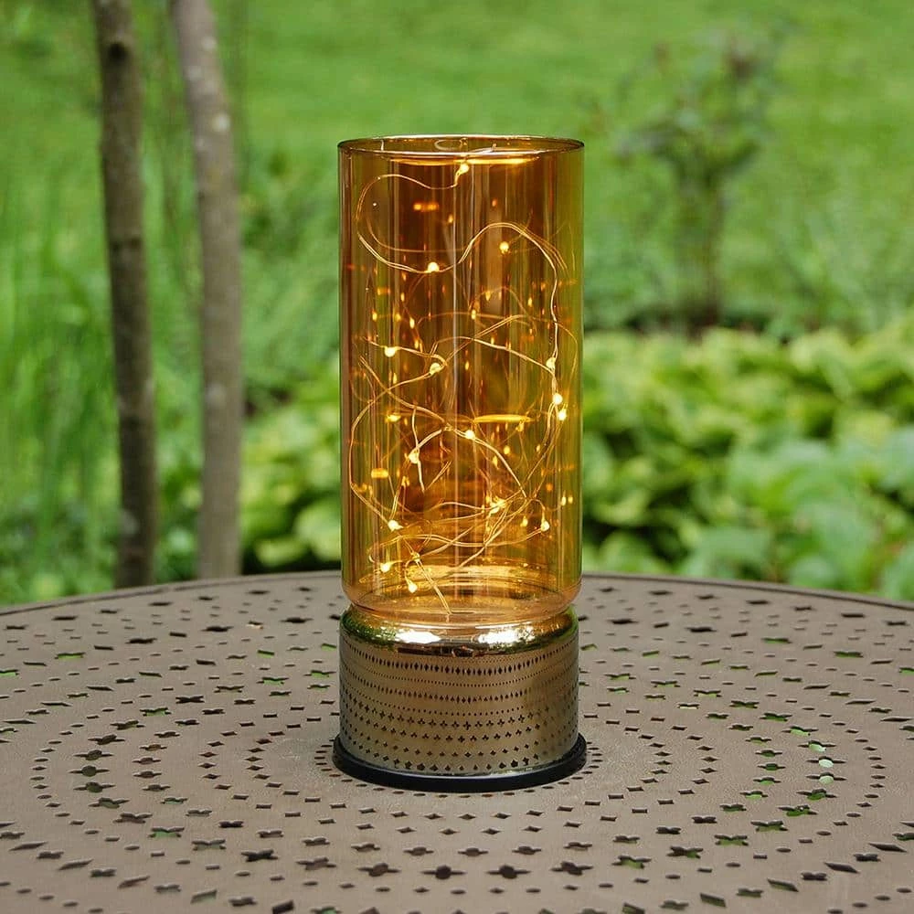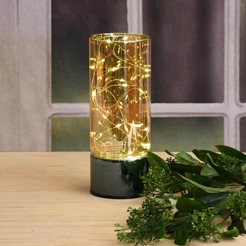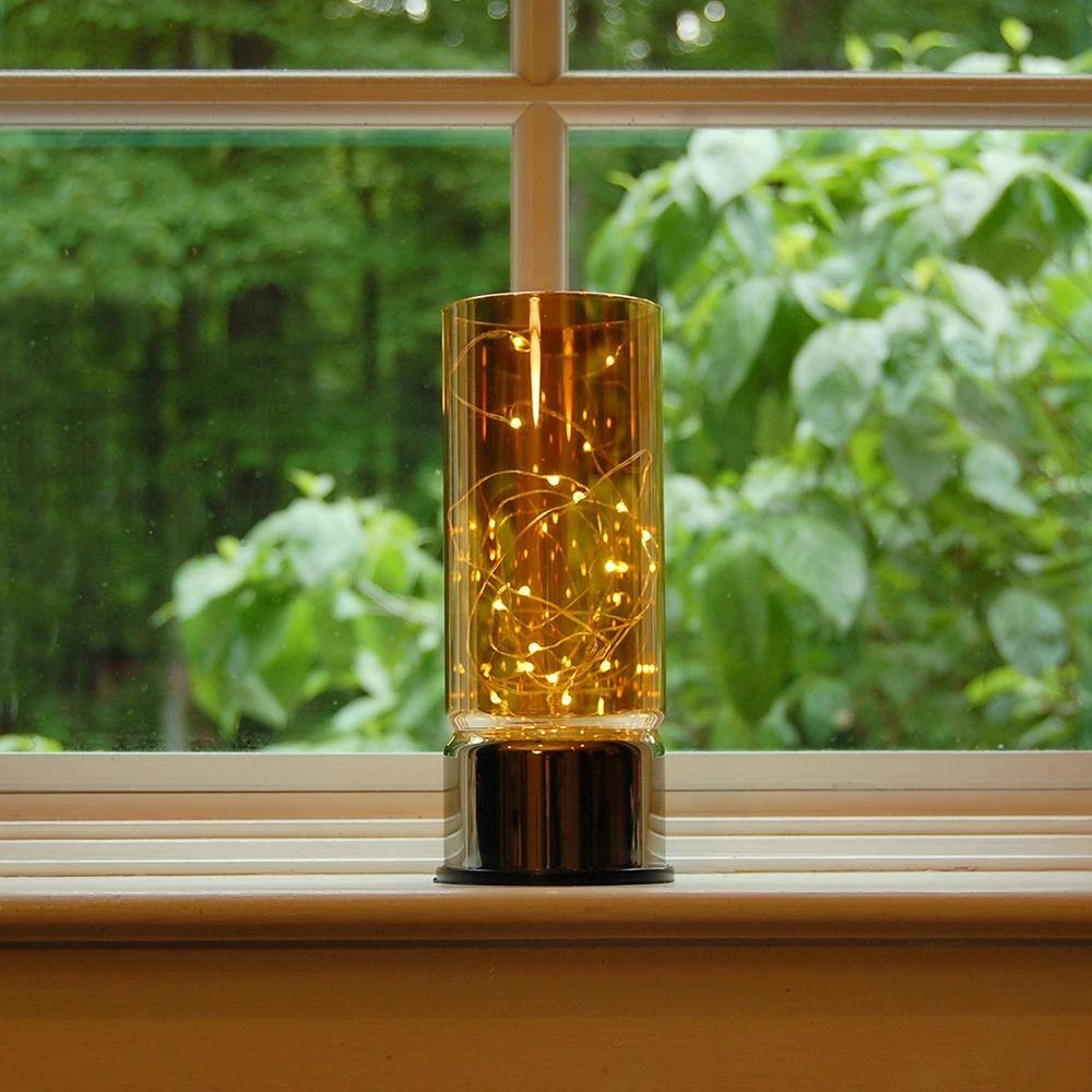 This amber glass lantern with mini string lights is a perfect accent piece for your home. This lantern is delightfully crafted with amber glass that has a iridescent amber finish on the top and a warm silver/gold on the bottom quarter. The intertwined 15 light mini string light creates a spectacular effect. With the reflective interior, it appears as if there are multiple little lights. This lovely lantern will add a warm glow and atmosphere to your overall home decor. Requires 3-AAA Batteries (not included).