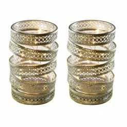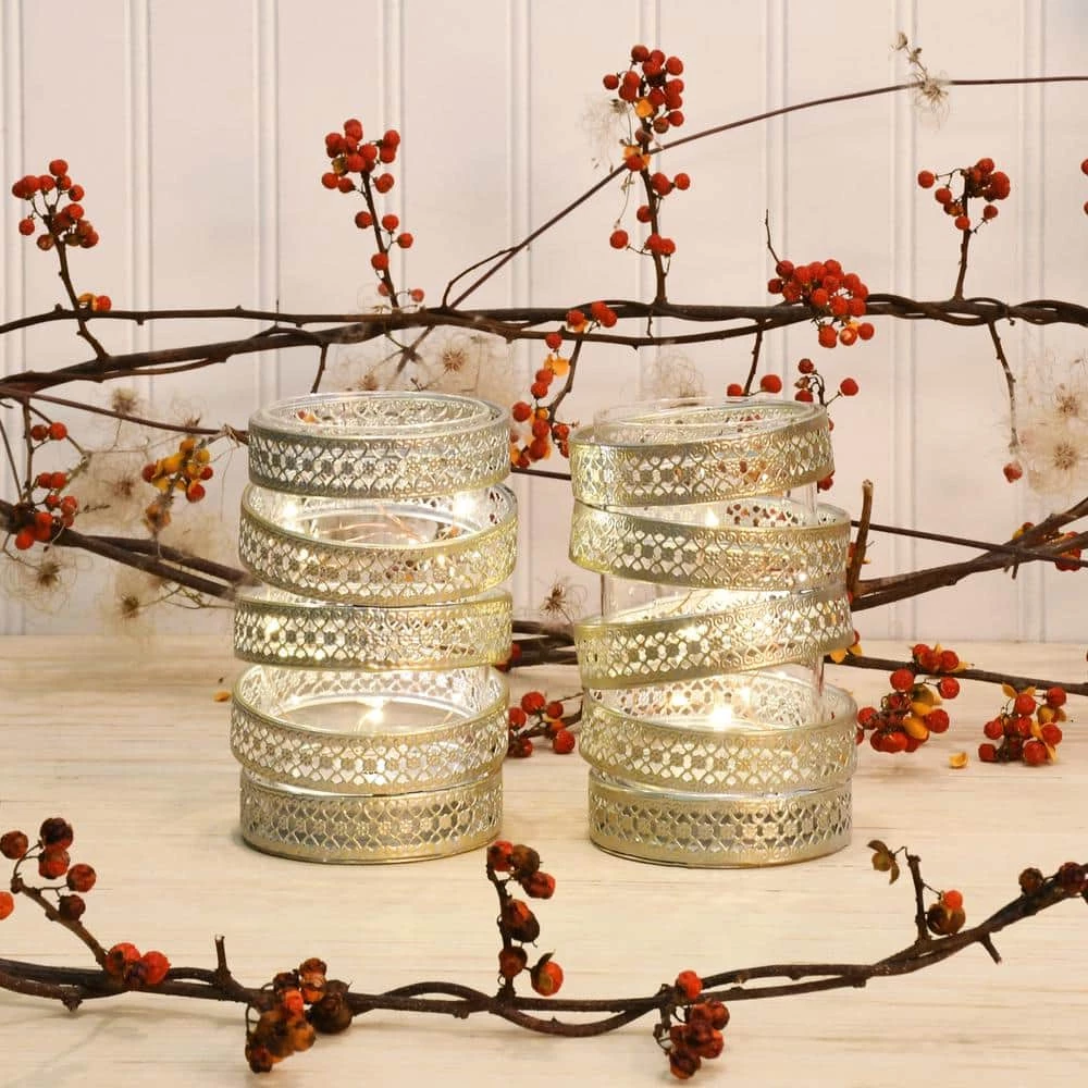 This set of battery operated antique gold decor lights will create an elegant atmosphere to your decor. These lovely metal spiral ribbon and glass holders are filled with warm white LED fairy string lights. They’ll add ambient lighting to your indoor home decor.
