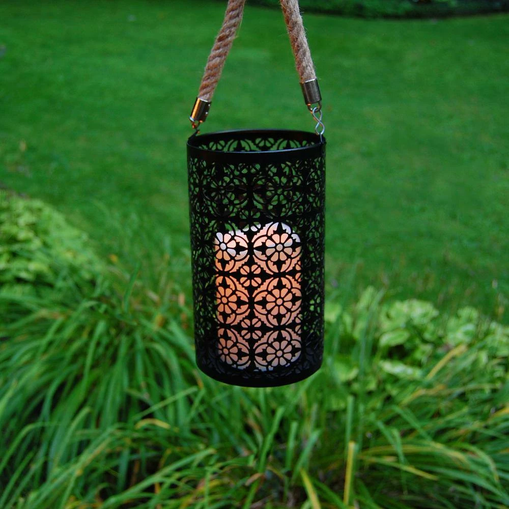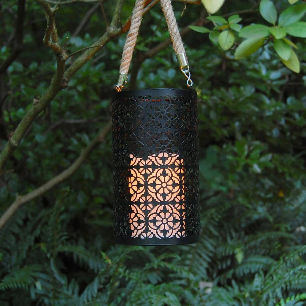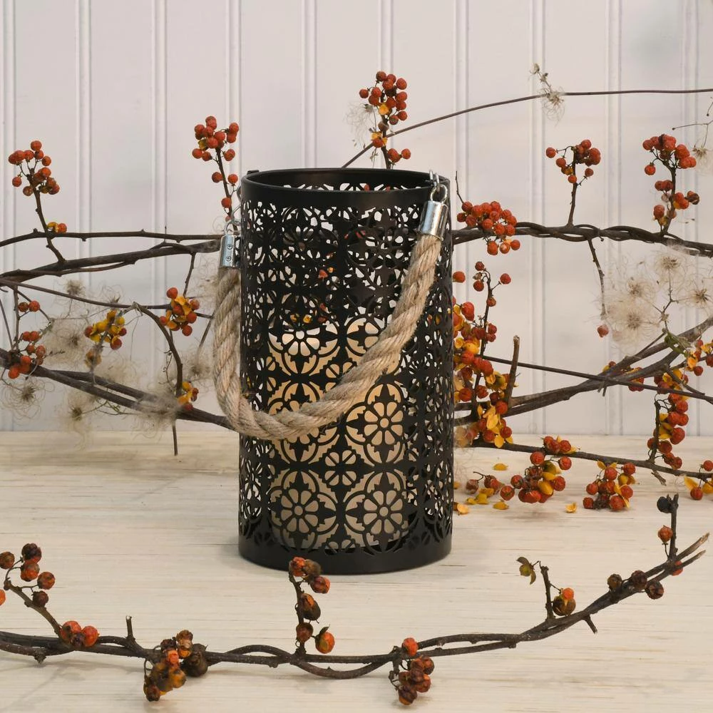 This contemporary metal lantern with a jacquard motif, jute handle and LED candle will create a stunning look to your decor. It will easily brighten up any occasion, event or everyday home decor. With a battery operated candle, this lantern provides lovely ambient lighting. The light source has a convenient timer incorporated with 5 hours on/19 hours off. Uses 3 AAA Batteries (not included)