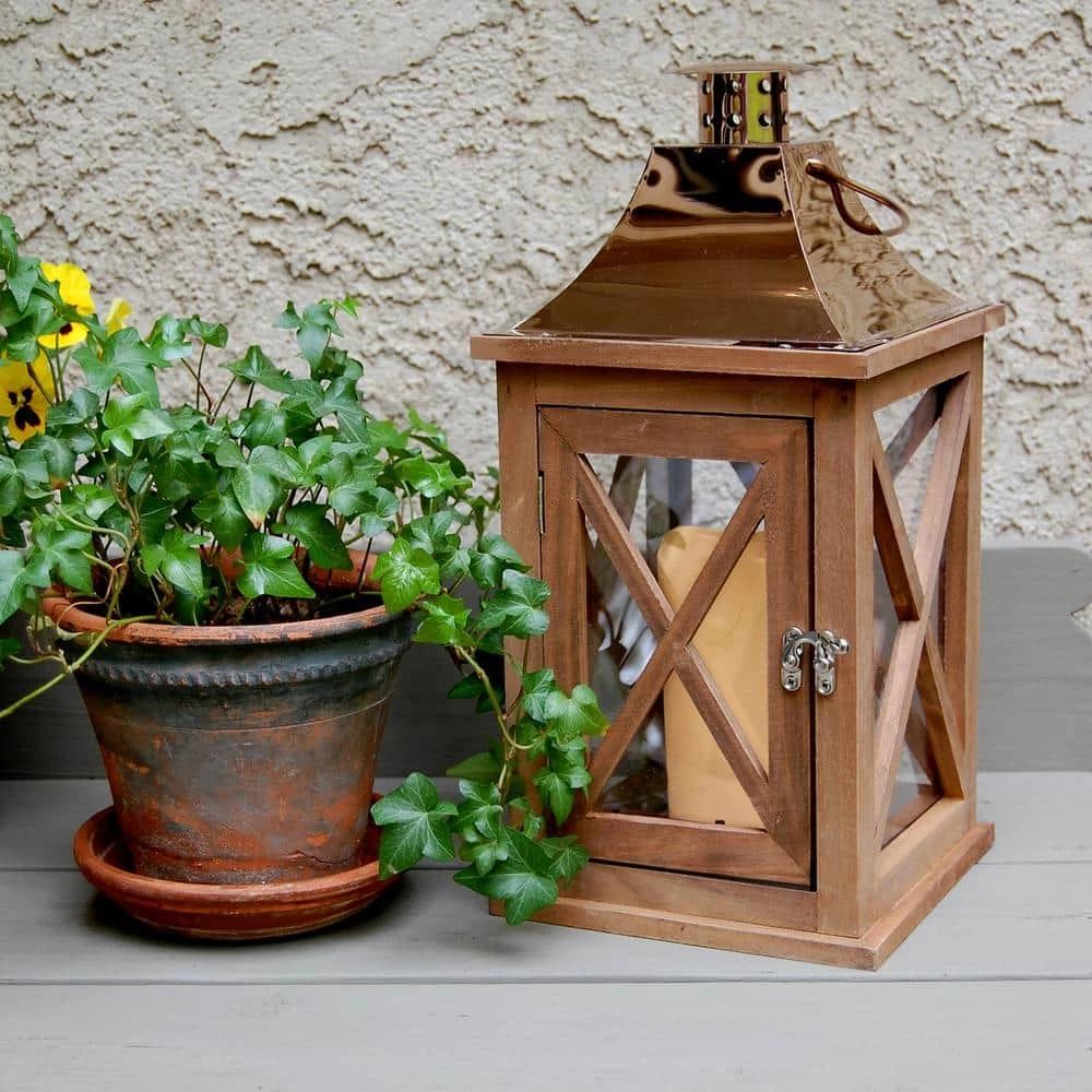 This beautiful natural wood lantern with a copper roof and LED candle will create a stunning look to your decor. It will easily brighten up any occasion, event or everyday home decor. The 4″ battery operated candle inside this lantern provides lovely ambient lighting. The light source has a convenient timer incorporated with 5 hours on/19 hours off. Uses 3 AAA Batteries (not included)