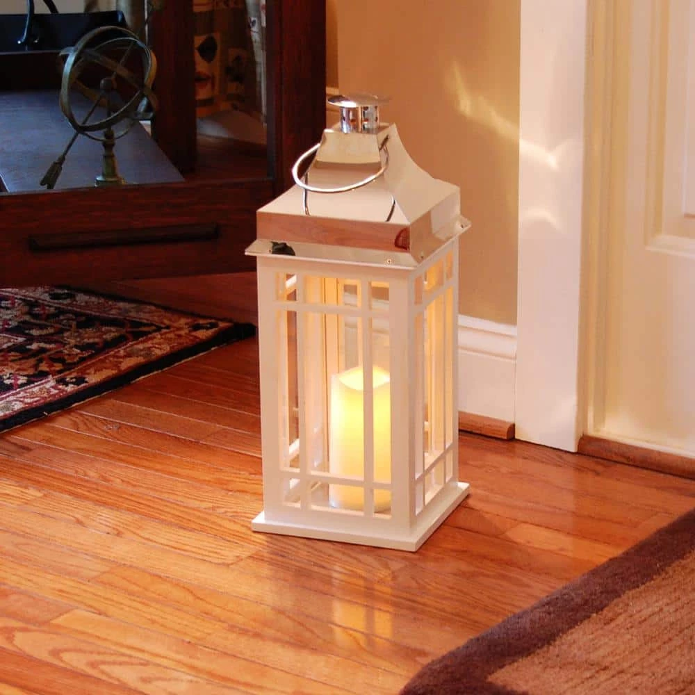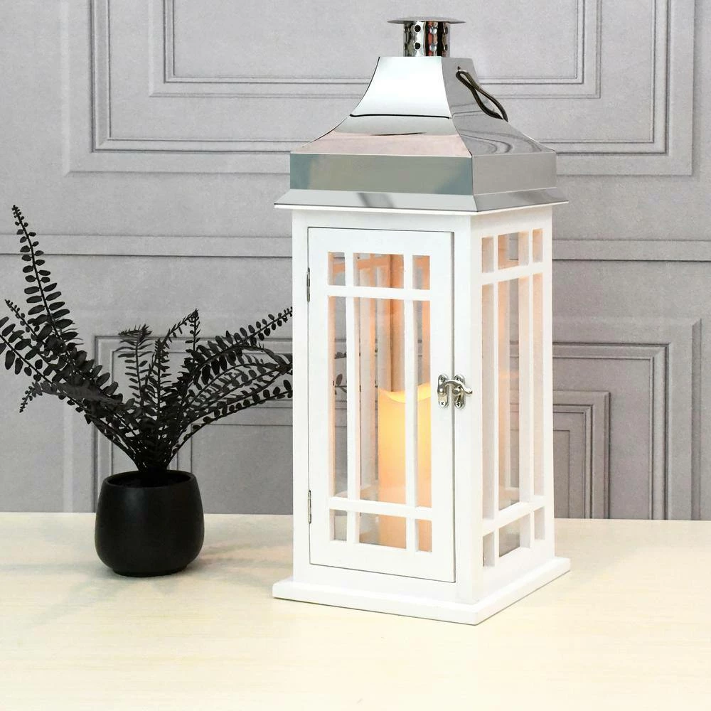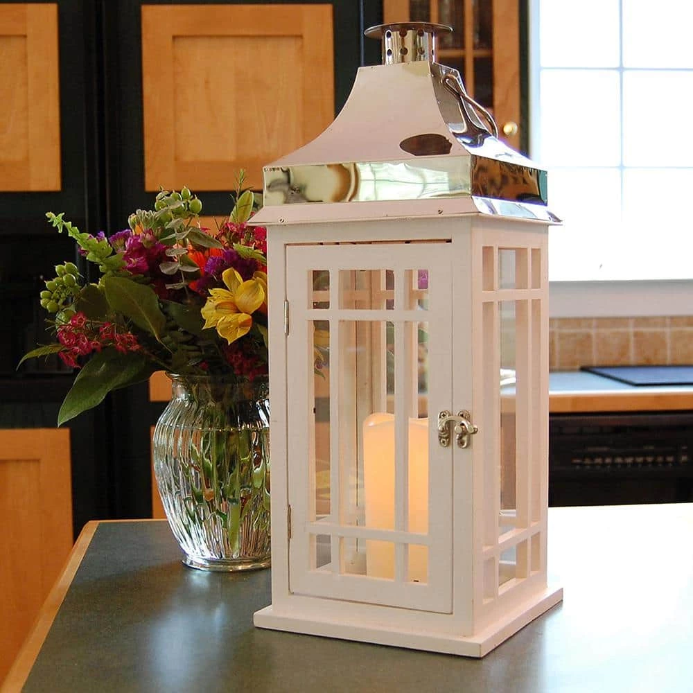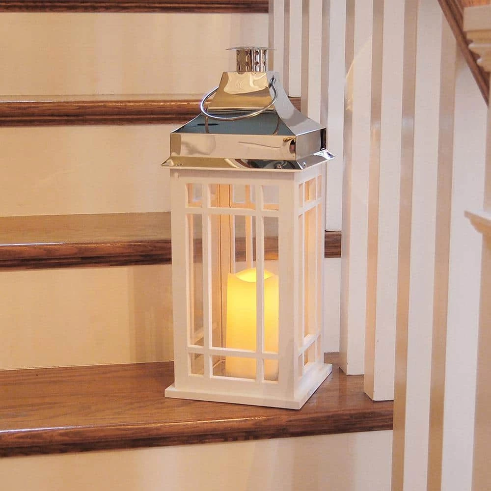 This beautiful white wooden lantern with a chrome roof and LED candle will create a stunning look to your decor. It will easily brighten up any occasion, event or everyday home decor. The 4″ battery operated candle inside the lantern provides lovely ambient lighting. The light source has a convenient timer incorporated with 5 hours on/19 hours off. Uses 3 AAA Batteries (not included)