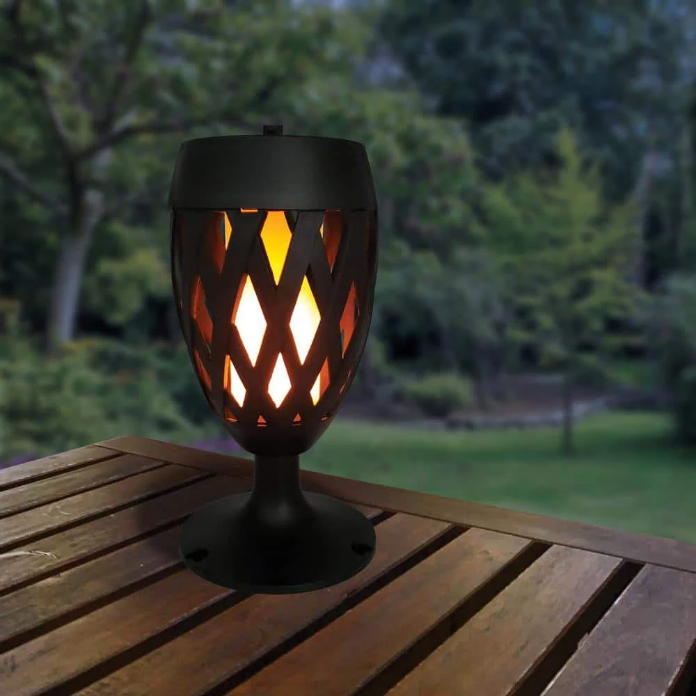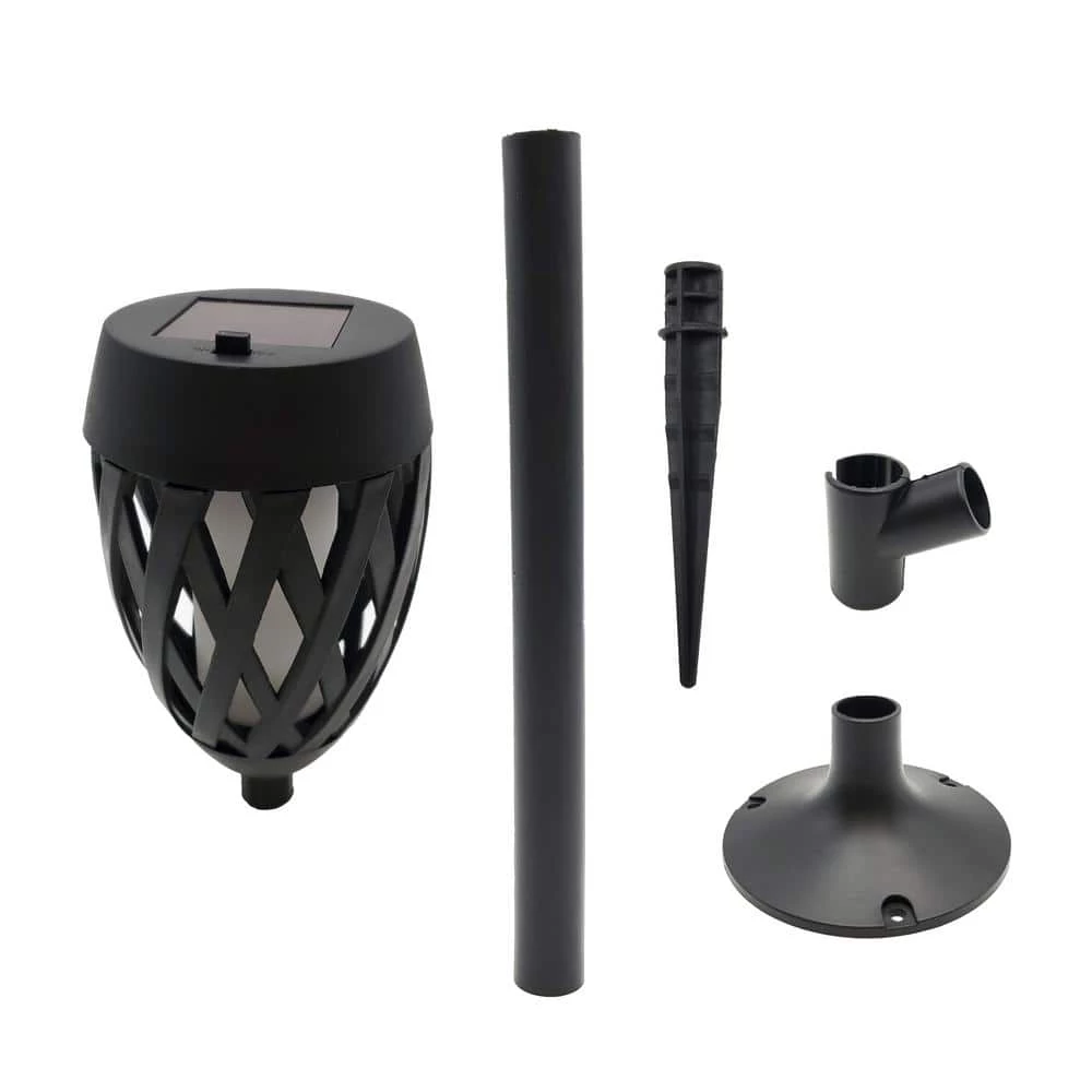 This multipurpose mini solar powered flame effect torch with removable base, stake and extender will create a warm and inviting atmosphere to your outdoor decor. Use the base to place on a hard surface to illuminate a table, porch, deck, walkway or driveway. Mount the base with included screws to illuminate a wooden deck, railing, wall or fence. For a tiki torch effect, remove the base and use the stake to place in the ground to light a pathway or garden. By adding or removing the extender, adjust the height for outdoor table settings or deck mounting. Charged by the sun, this versatile mini solar powered flame effect torch will add creative ambient lighting to your outdoor decor.