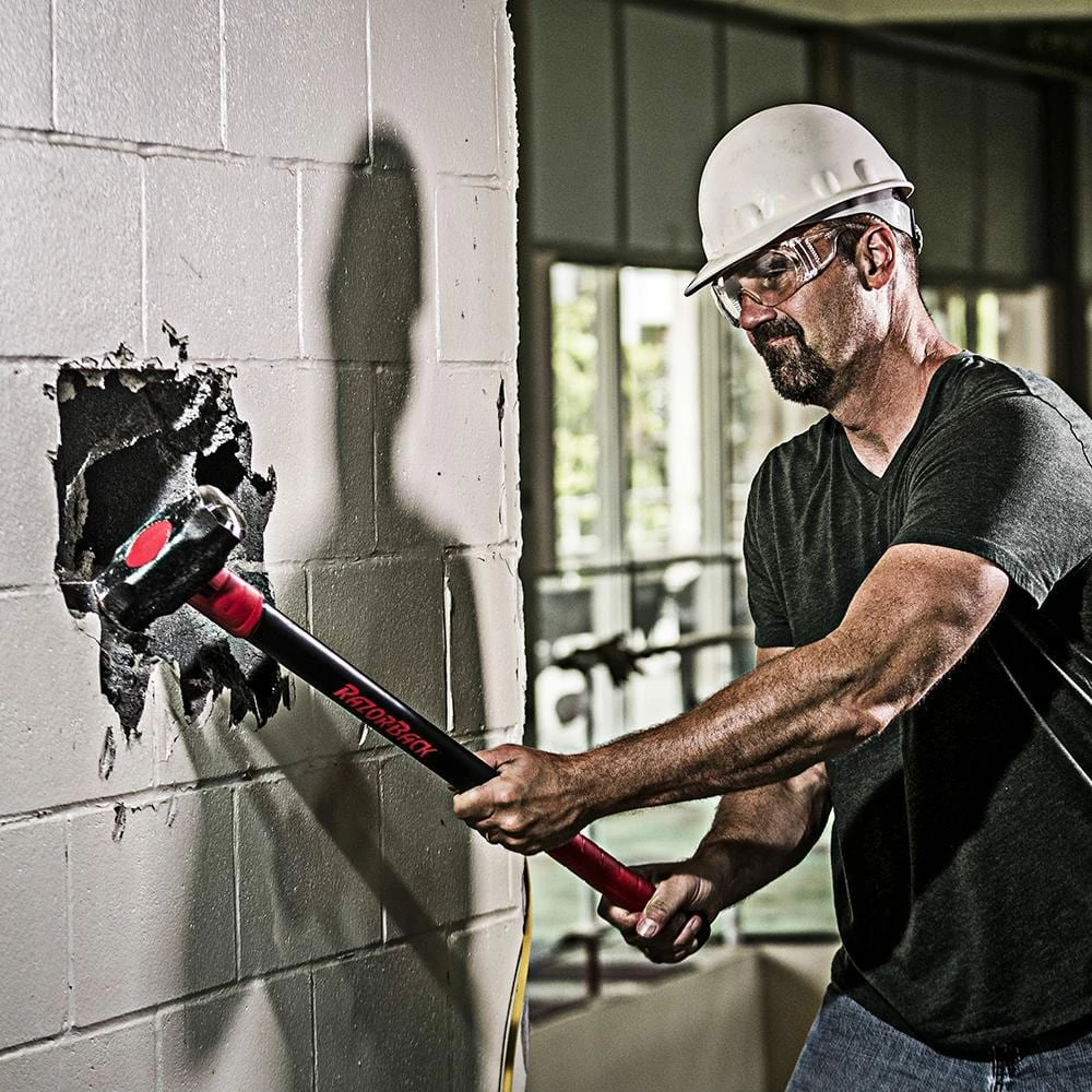 The Razor-Back #8 Sledge Hammer is constructed with a 34 in. fiberglass handle and forged steel head. This sledge hammer is ideal for demolition of concrete, tile, and drywall. The patented head to handle connection has a reinforced steel pin for improved safety and is a great choice for professionals.