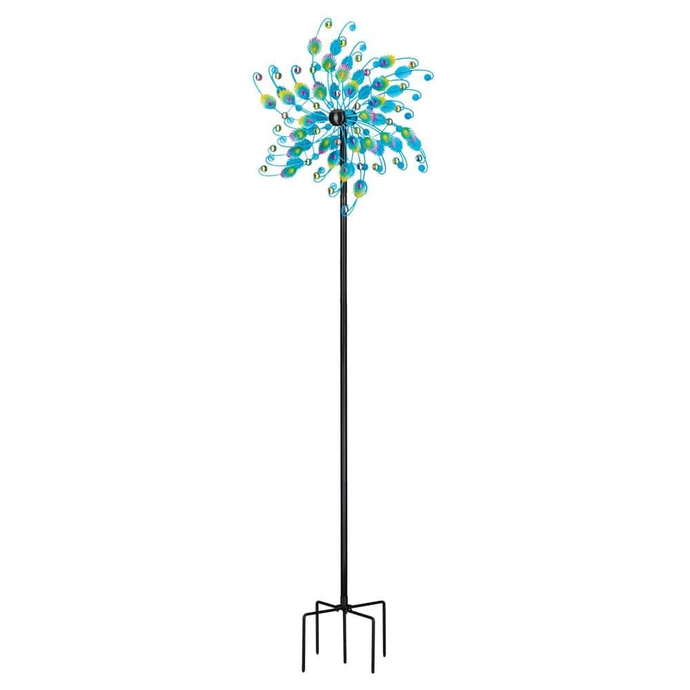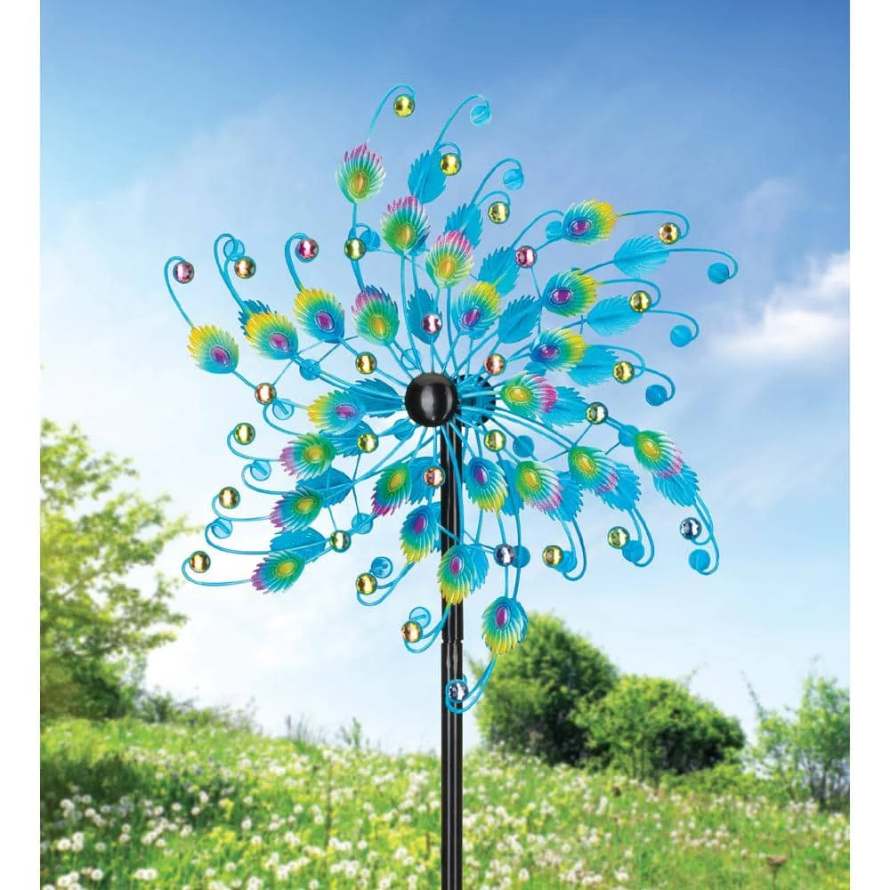 Beautiful Peacock tail feather colors make up the blades along with faceted gems that glisten in the sun. The top pole of this rotating wind spinner turns a full 360 degrees, along with opposite spinning front and back spinner blades. Regardless of wind direction, this spinner will rotate to face it.
