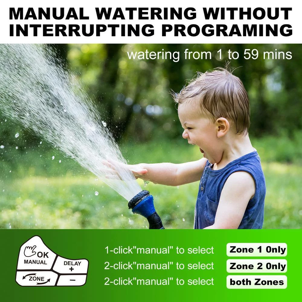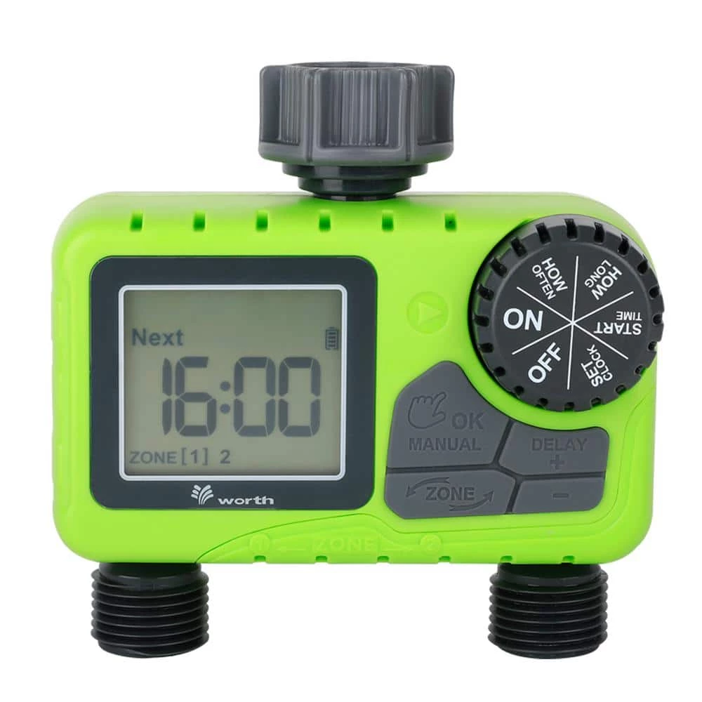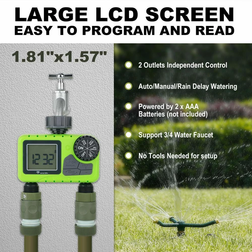 The 2-outlet watering meter is made of durable plastics. It weighs 0.9 lb. It is powered by 2 x 1.5V AAA Alkaline batteries. The watering durations and frequencies can be set easily. It is a simple and functioning addition to your garden.