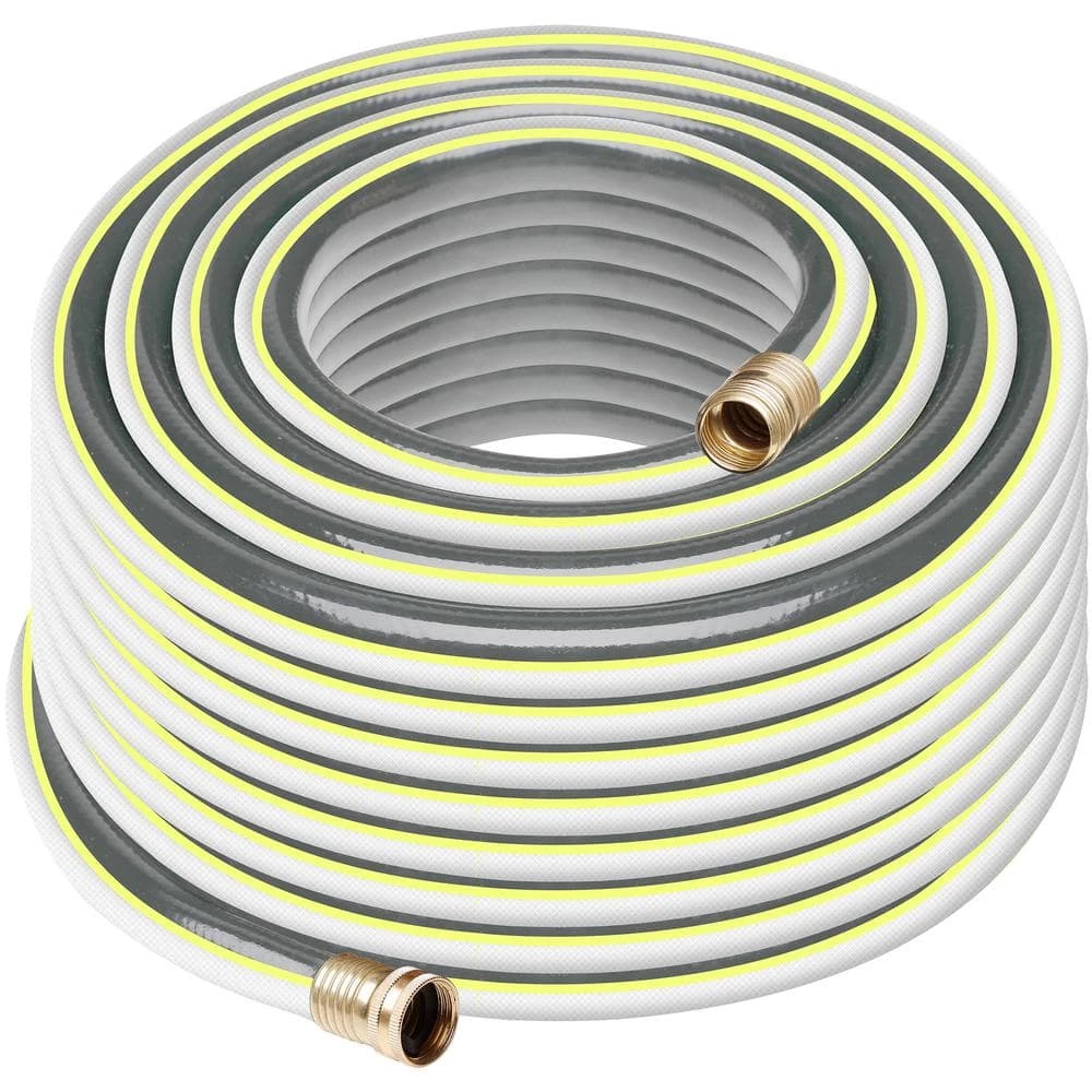 The 3/4 in. x 100 ft. medium-duty gray garden hose is 17.5 lbs. It is made from lead free vinyl. It has a 12-year warranty. It is a strong and useful add on to your gardening needs.