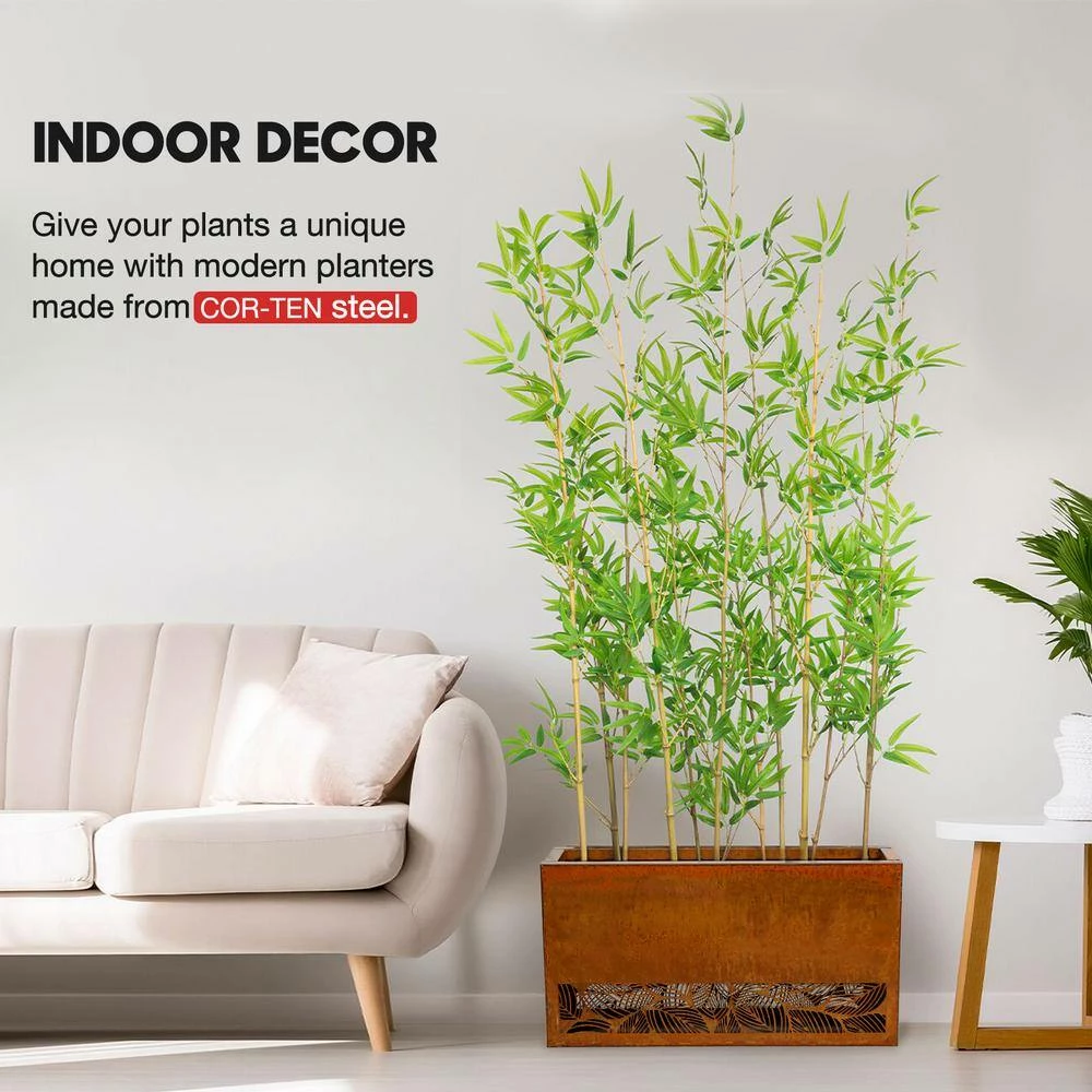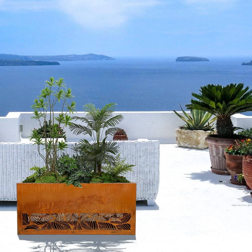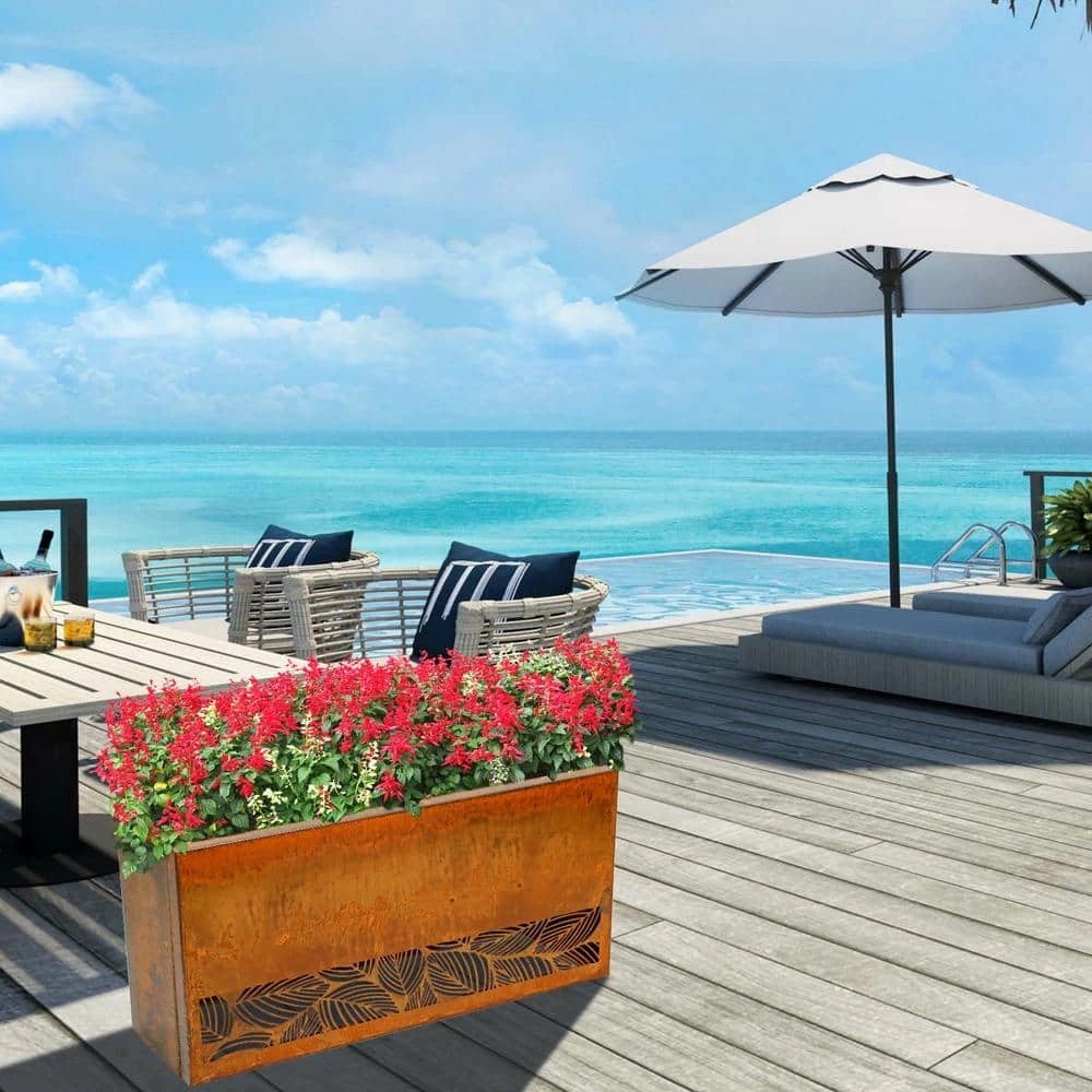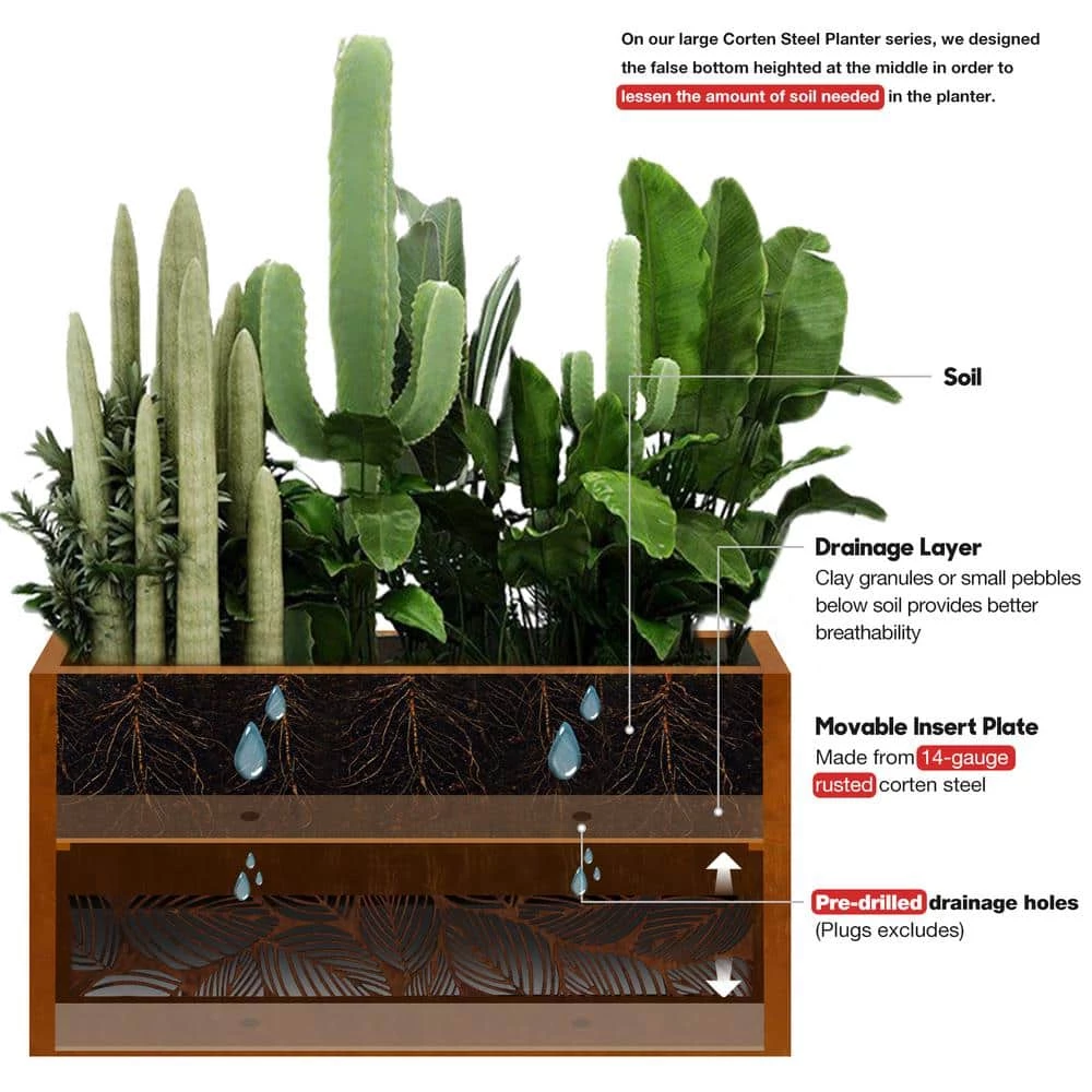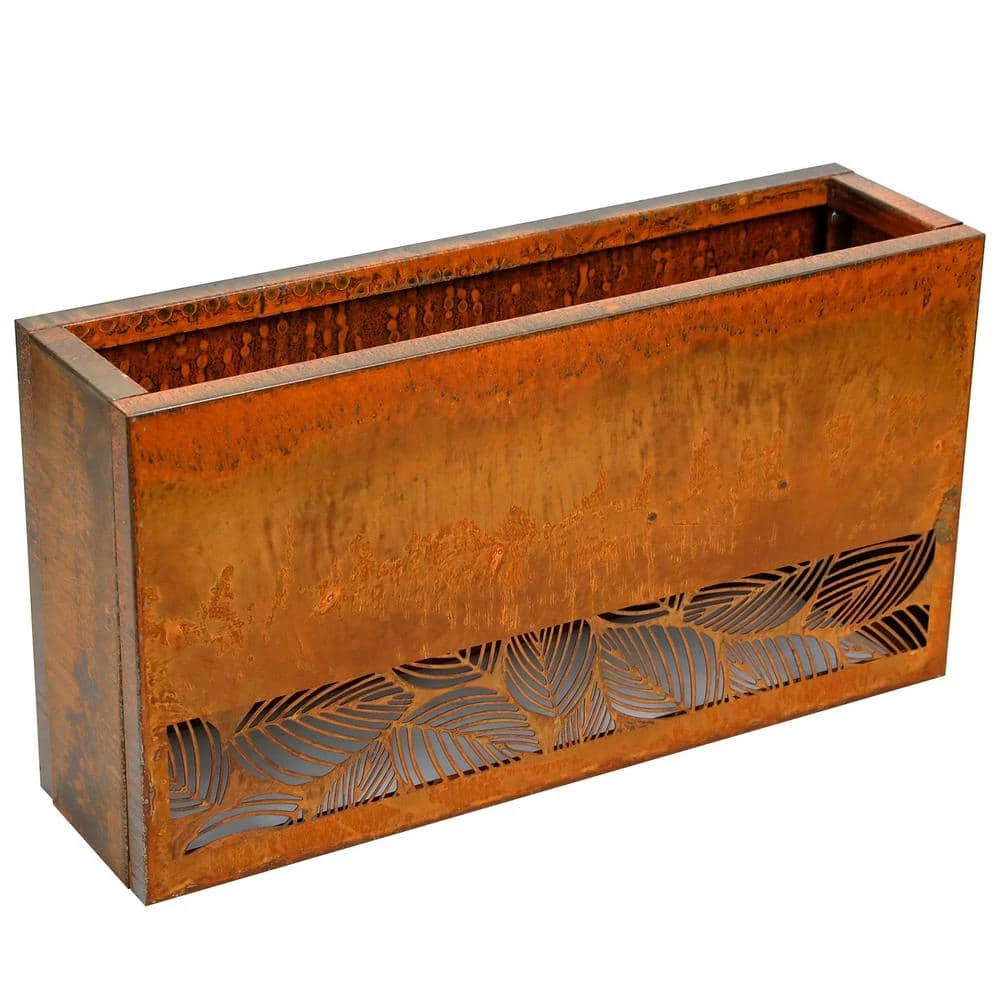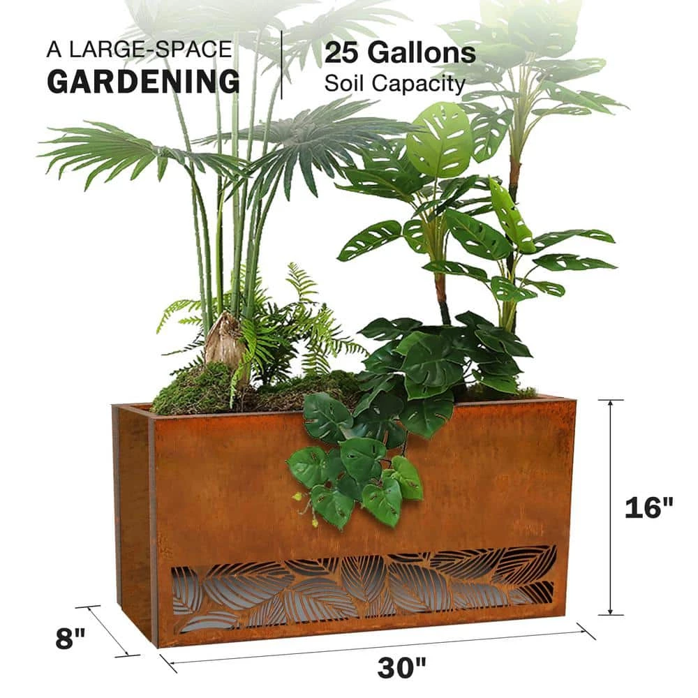 The rectangular Corten steel planter is 30 in. (L) x 8 in. (W) x 16 in. (H) and weighs 22 lbs. The open base has a cut out leaves pattern on the bottom. It comes with a 2-level depth fitting slots and a shelf that enables the plants to fit inside the planters at different height choices. The rustic look blends right in with natural environment. It is ideal for planting vegetables, fruits, herbs and etc.