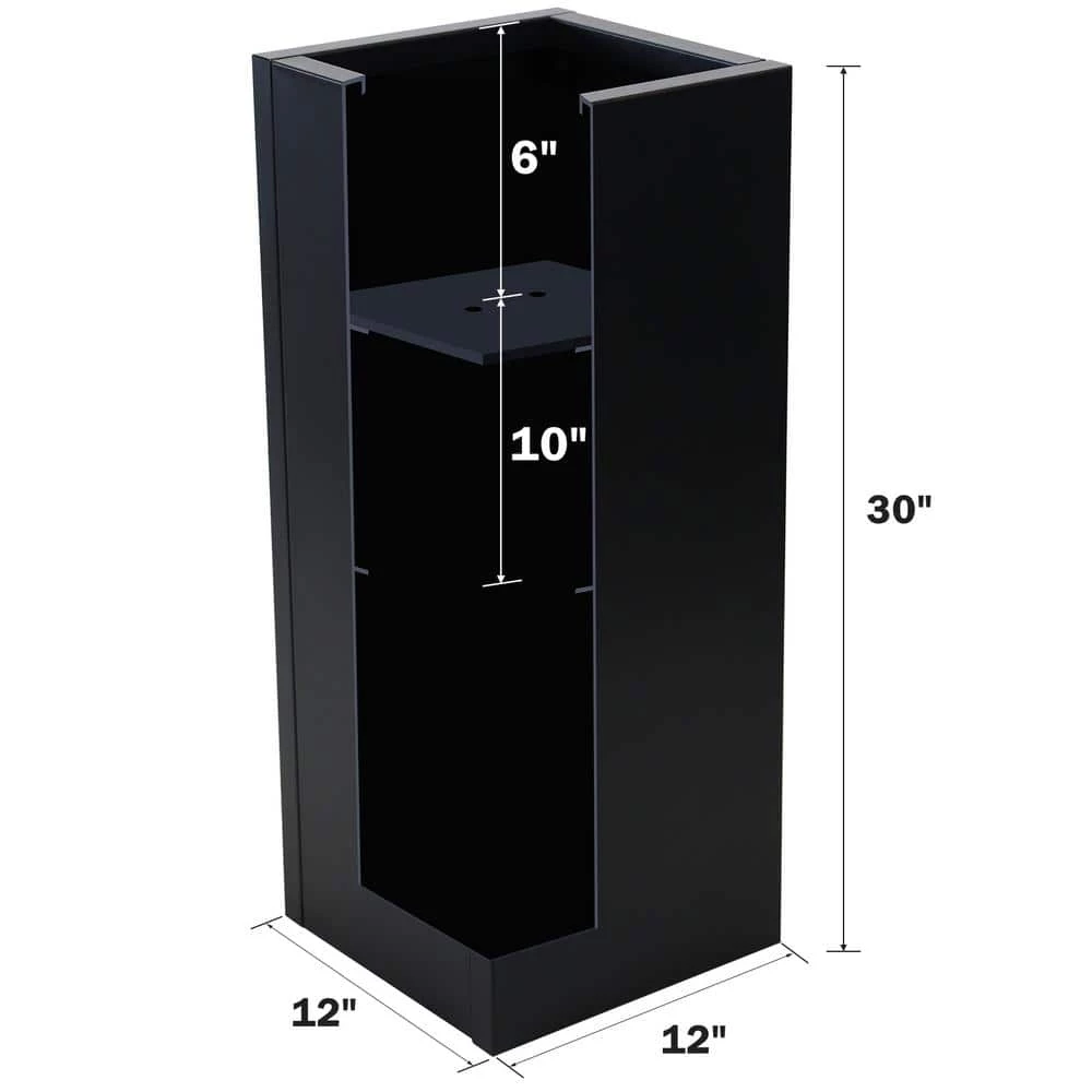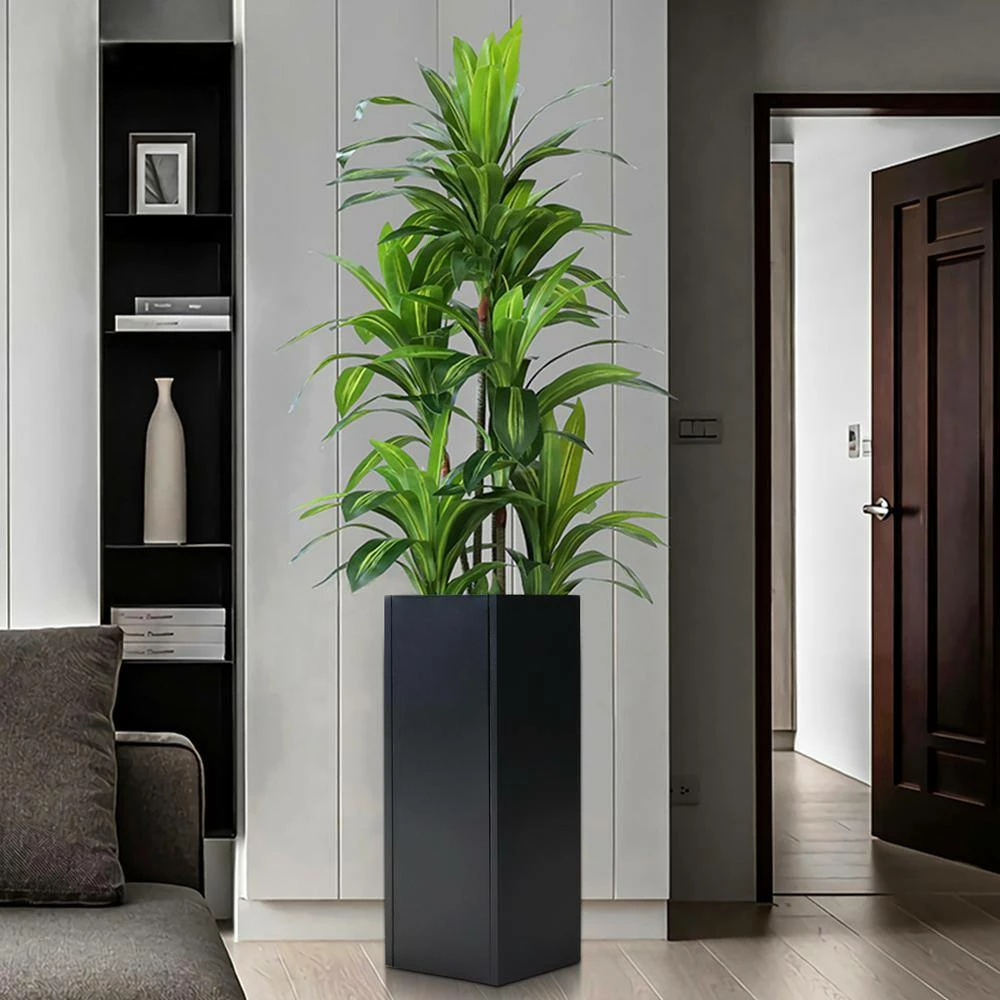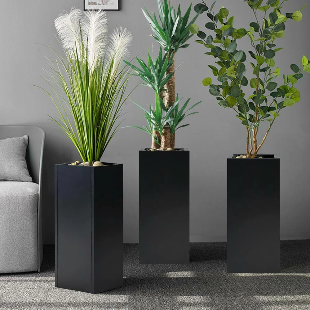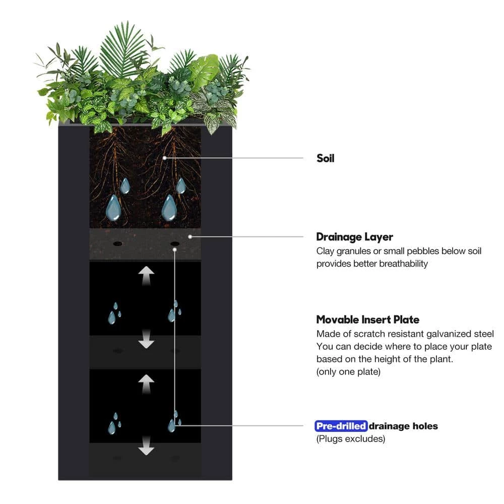 The cubical shaped planter is 12 in. (L) x 12 in. (W) x 30 in. (H) and weighs 24 lbs. It is made of solid steel galvanized in black paint. It comes with a 3-level depth fitting slots and a shelf that enables the plants to fit inside the planters at different height choices. The strong and understated appearance brings a sense of tranquility to the living environment.