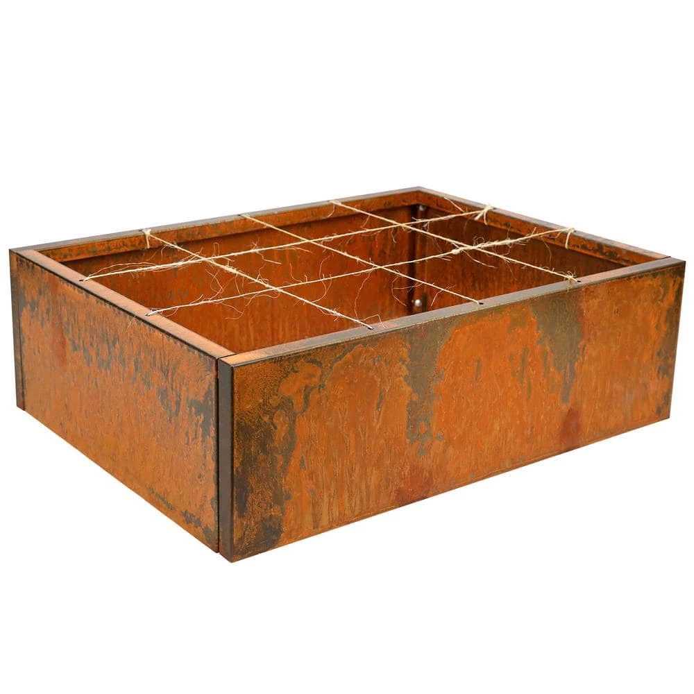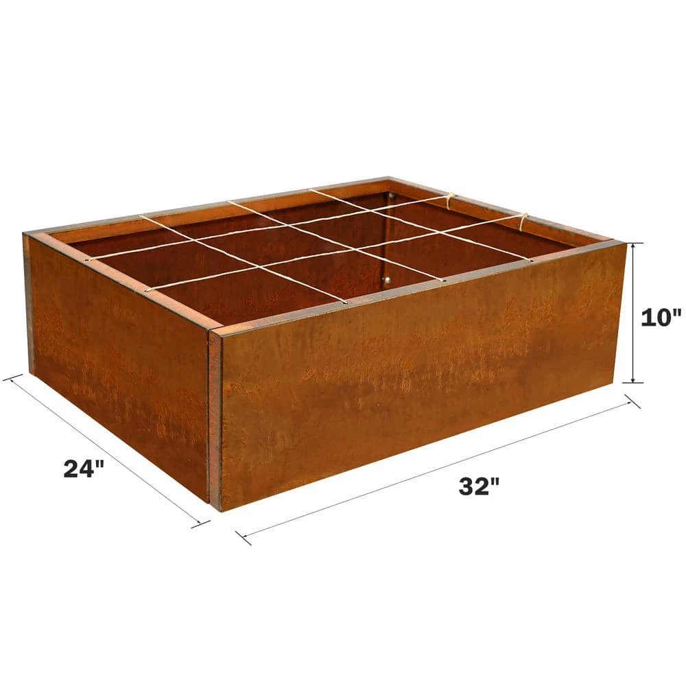 The rectangular Corten steel raised bed is 32 in. L x 24 in. W x 10 in. H and weighs 15.4 lbs. The simple structure makes it an attractive add- on to your garden. The rustic look blends right in with the natural environment. It is ideal for planting vegetables, fruits, herbs & etc.