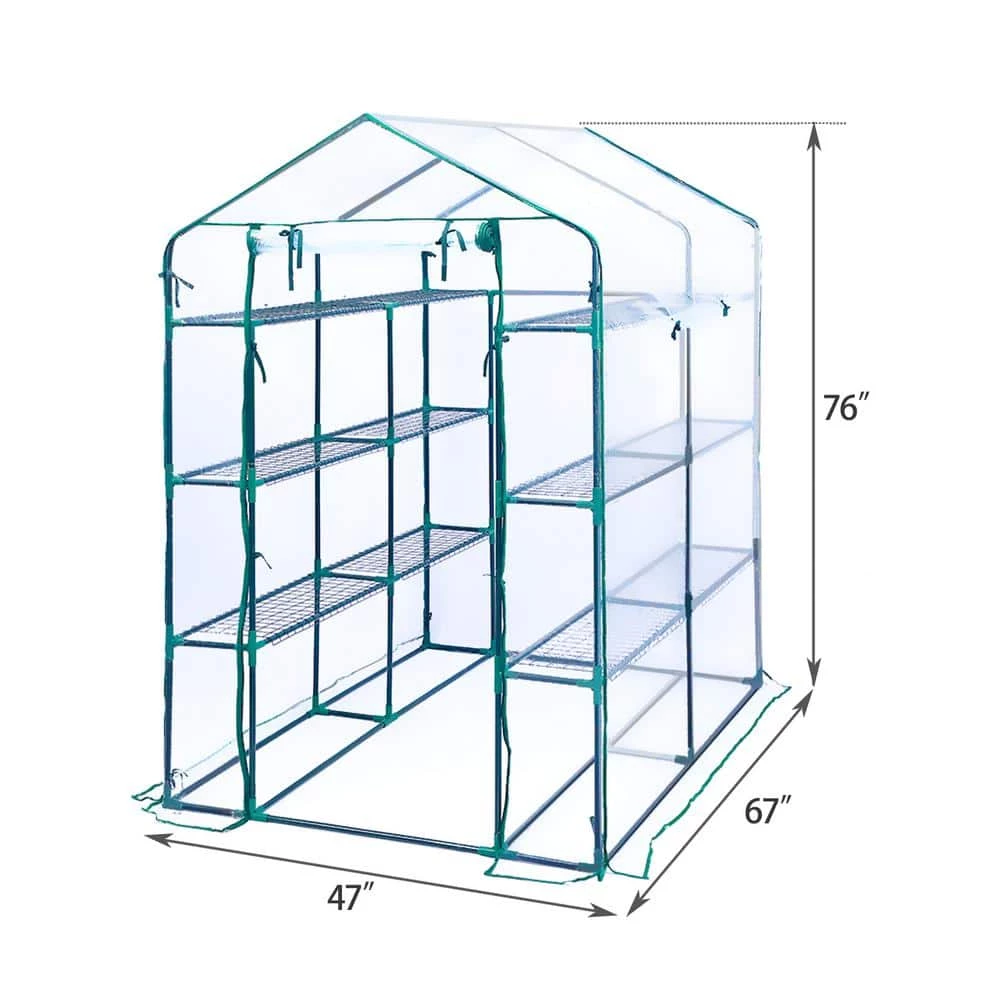 - Assembled dimensions: greenhouse stands 76 in. H x 67 in. W x 47 in. D, shelves are approximately 28 in. L x 11 in. W giving a total area of 308 sq. ft. of plant growth shelf space