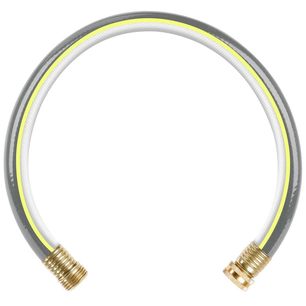 The 5/8 in. x 2 ft. medium-duty gray garden hose is 0.4 lbs. It is made from lead free vinyl. It has a 12-year warranty. It is a strong and useful add on to your gardening needs.