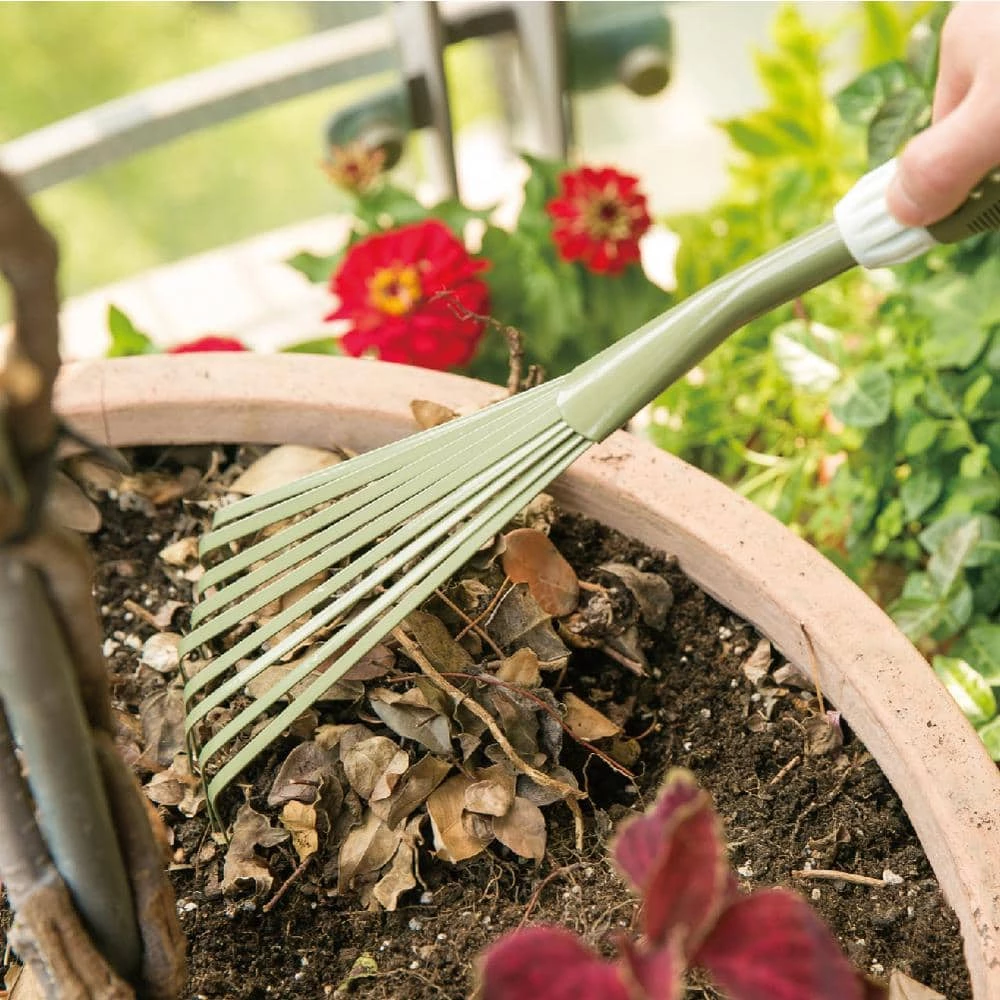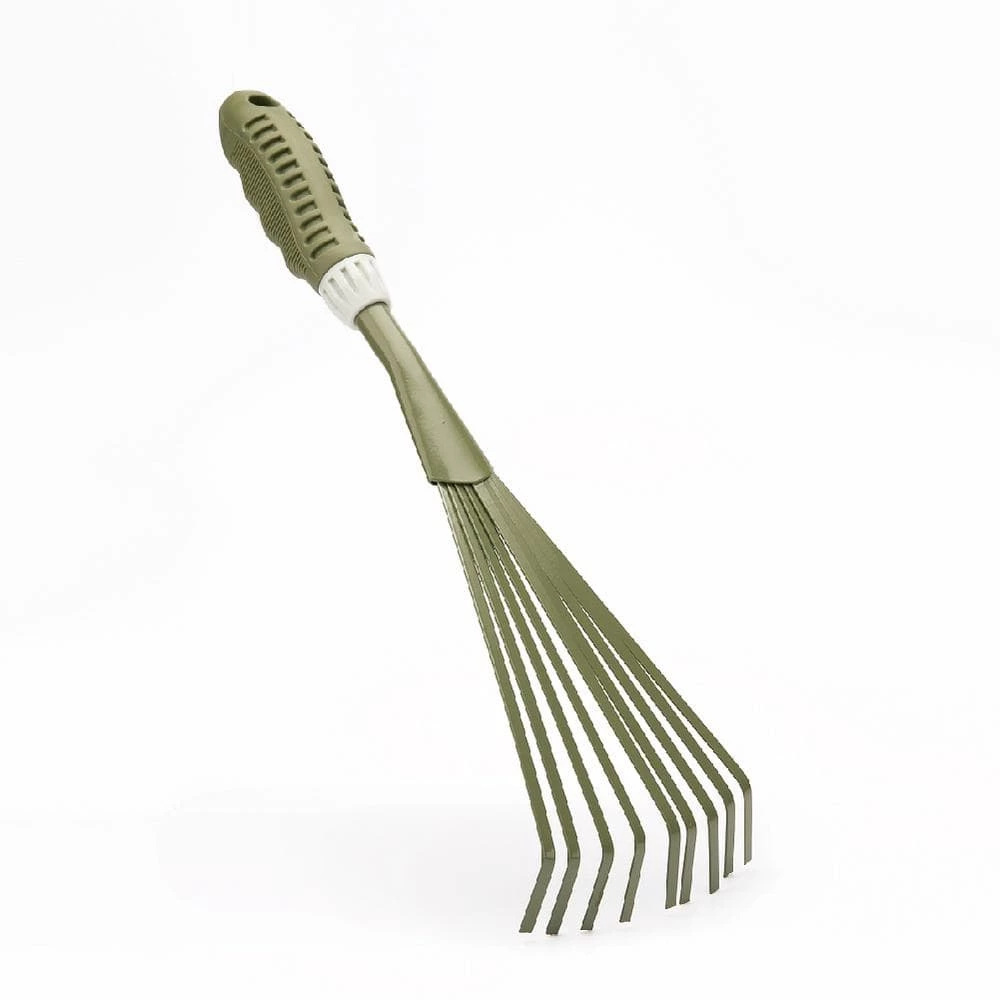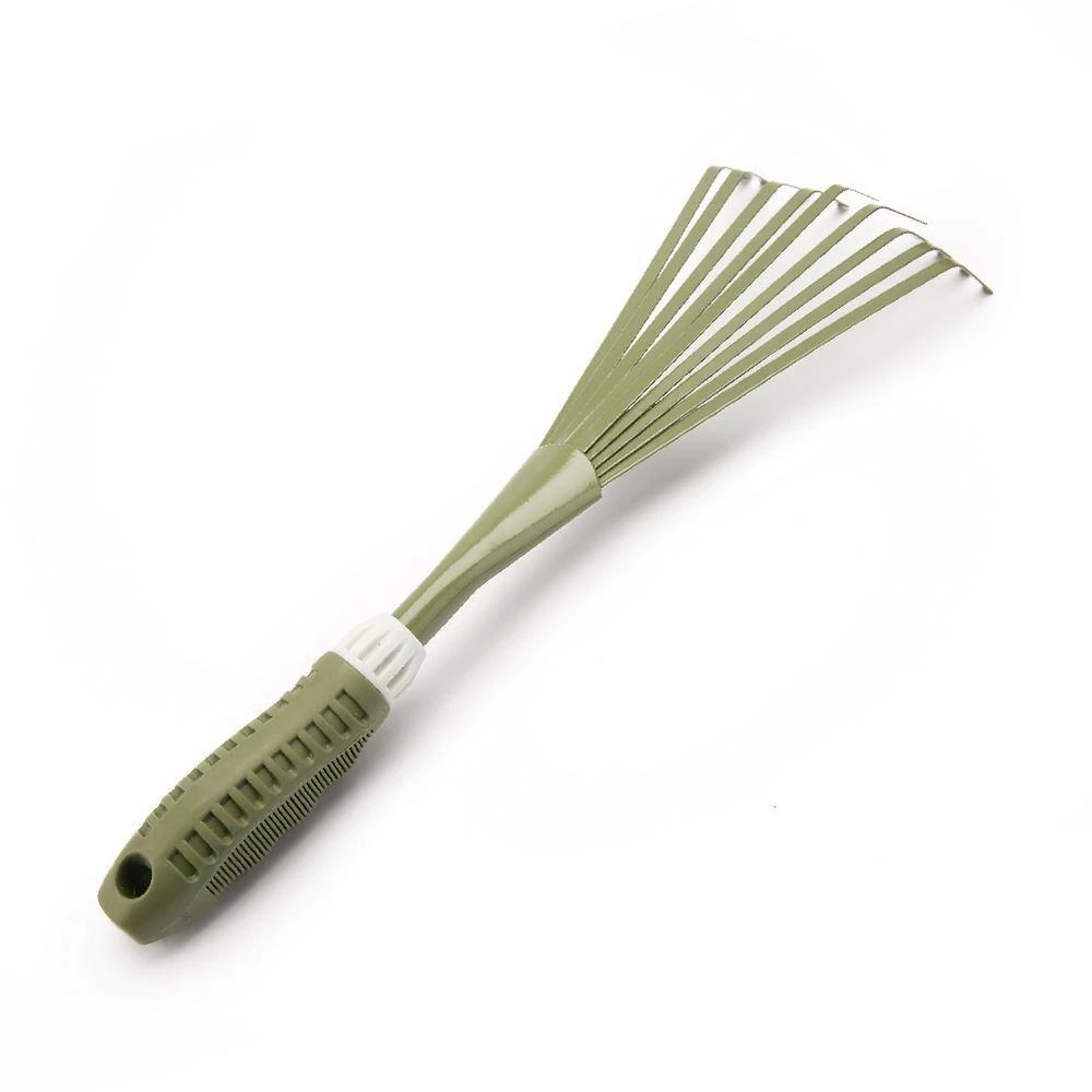 The 15.5 in. long 9 teeth broom weights 0.5 lb. The powder coated carbon steel head is light and durable. The generous length of the teeth helps gathering dry leaves and flowers on the ground, less bending on your back. The ergonomic handle is comfortable for holding.