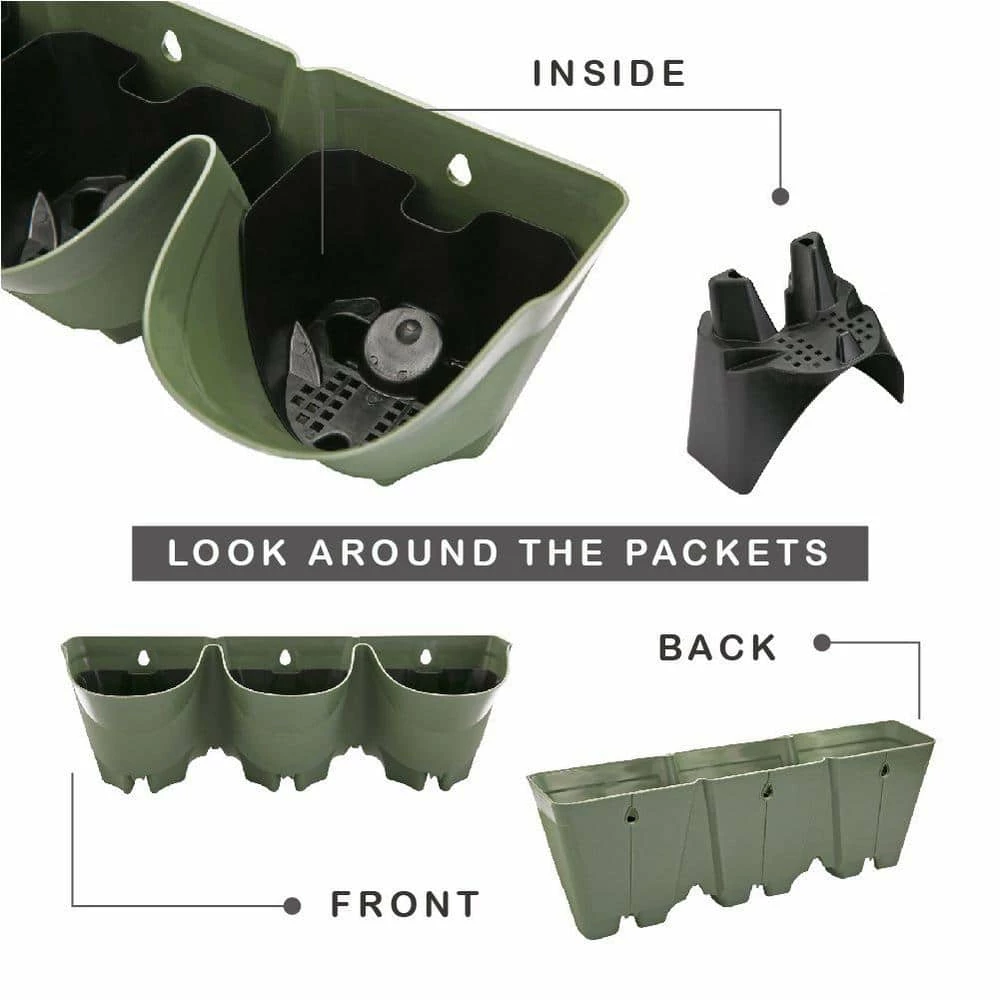 The 24 in. self-watering vertical garden wall planters have 36 pockets and 4 inner baskets that hold plants, herbs and etc. The total weight is 9.5lb. The dimensions are 18 in. x 13 in. x 15 in. They are made of strong plastic. The planters are designed to hang on walls. The effect is more striking when multiple layers are hung horizontally. The water can flow from top to bottom layers through the reservoir holes in the planters.